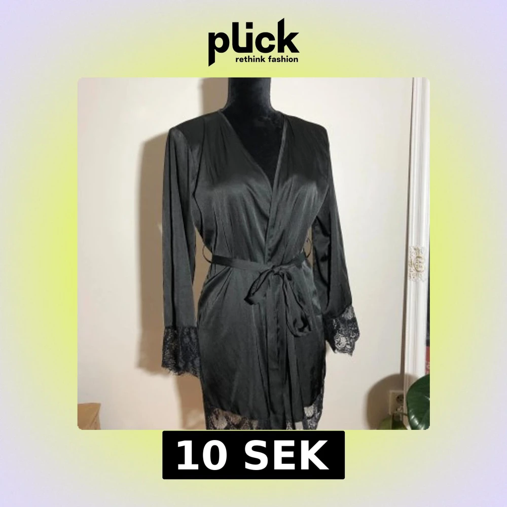 Svart kort morgonrock med spets och knytning i midjan. Längd ca 80cm. Ärmlängd ca 60cm. Pris: 10kr