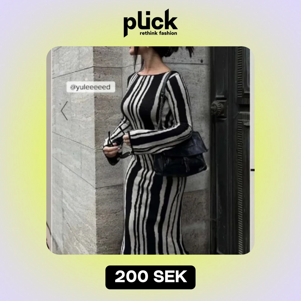Säljer en supercool svart och vit randig klänning med långa ärmar. Den har en tight passform som verkligen framhäver figuren. Perfekt för en fest eller en utekväll! Materialet känns mjukt och bekvämt.