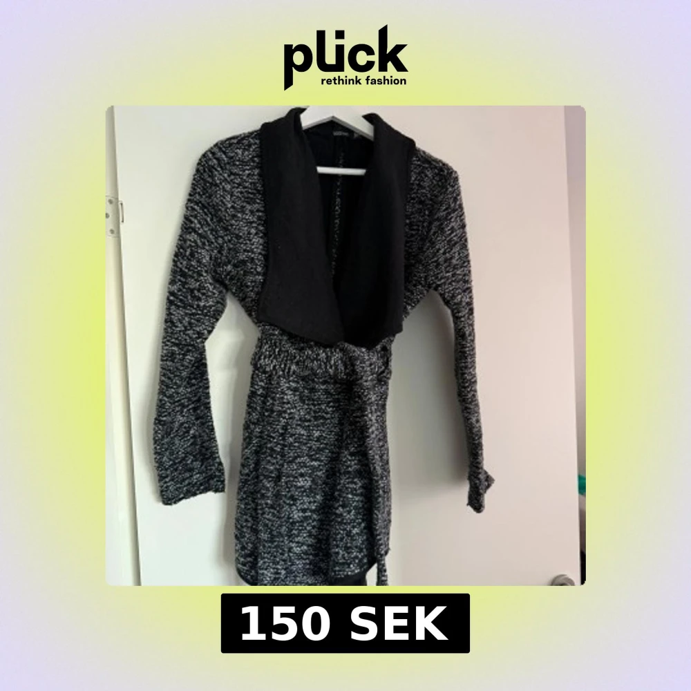 Mysig svart och grå stickad klänning från Boohoo med långa ärmar och en bred krage. Perfekt för kyligare dagar med sin bekväma passform och stilrena design.