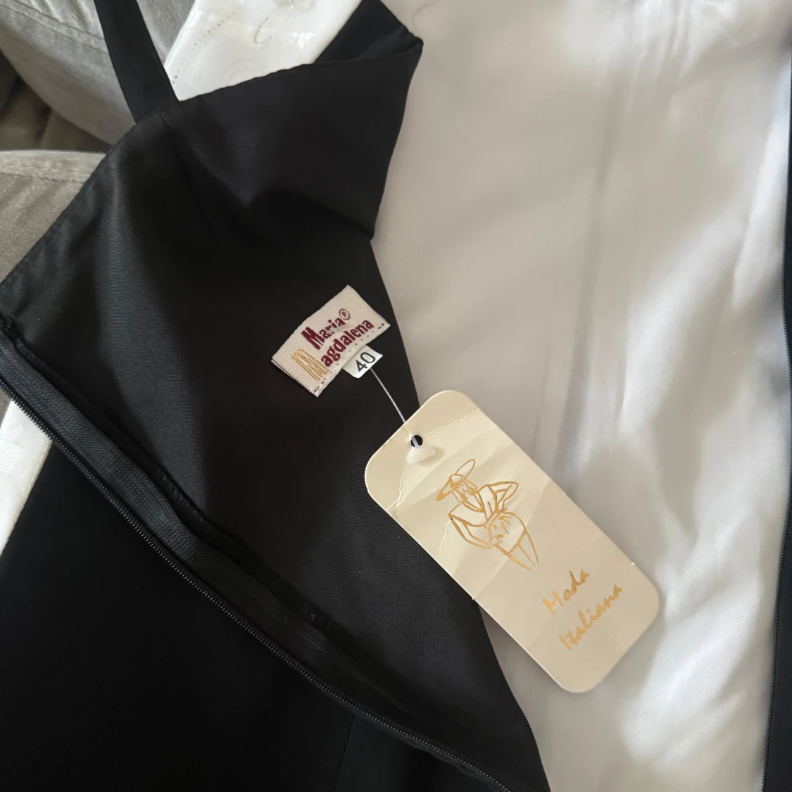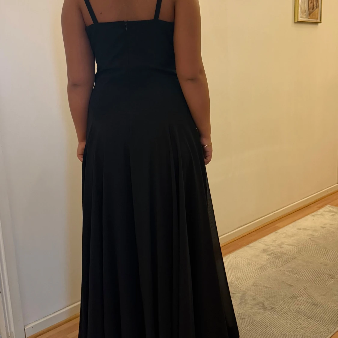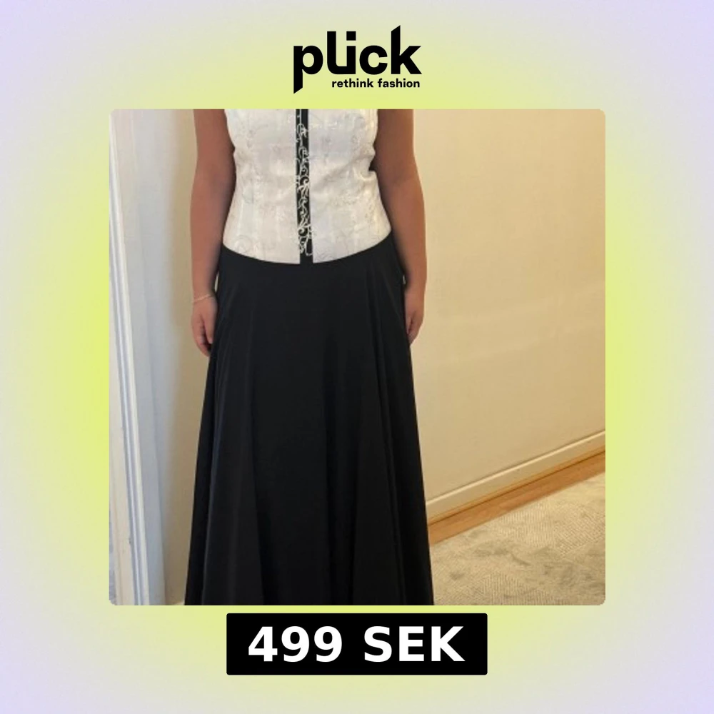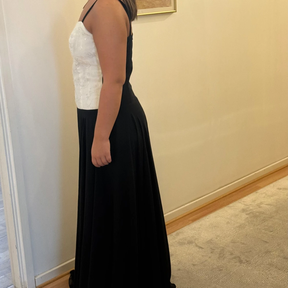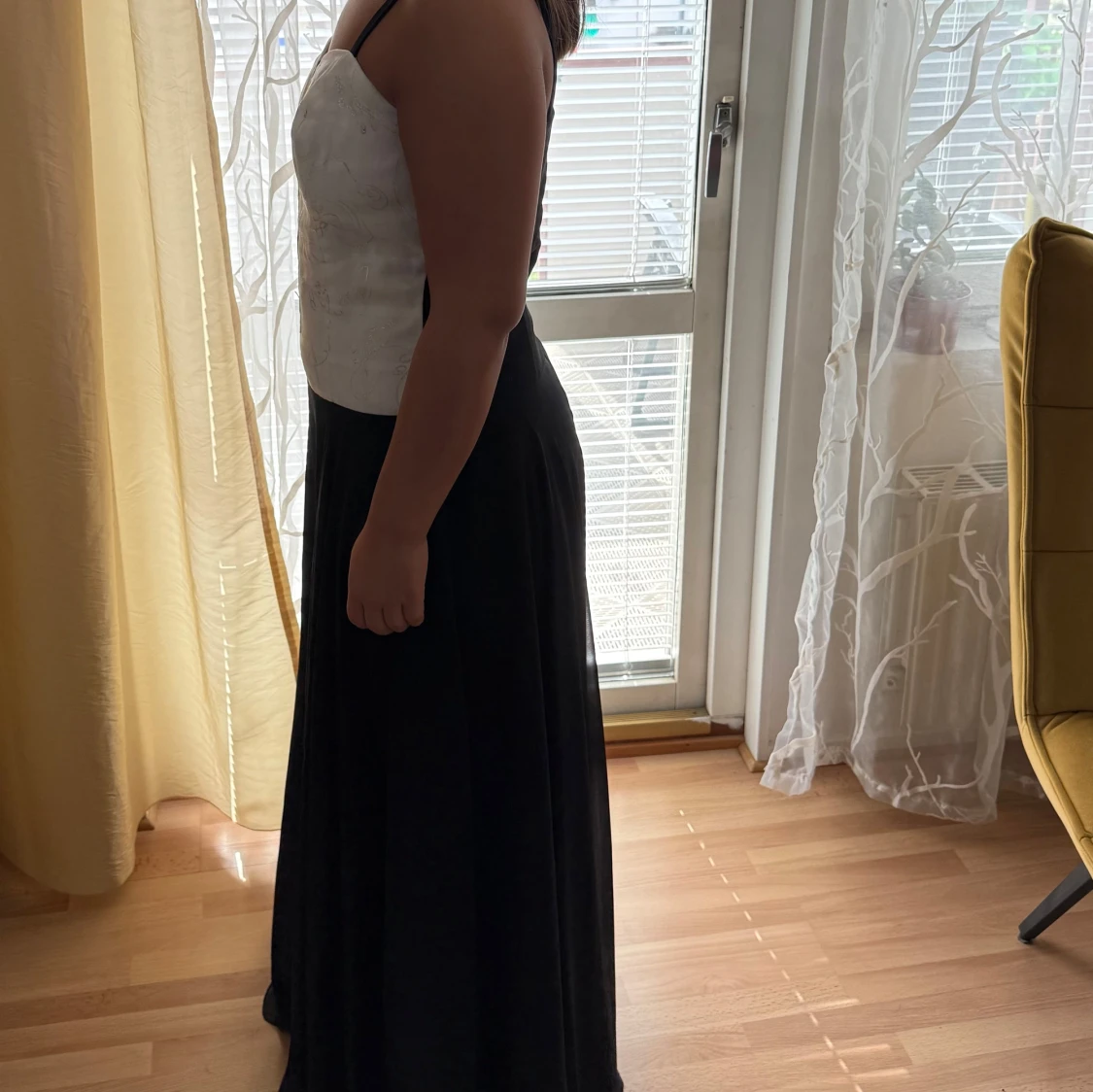 Snygg långklänning med svart, vid kjol och vit, broderad överdel med tunna axelband. Överdelen har dekorativa detaljer och en smal svart kant framtill. Perfekt för bal eller student. Kjolen faller mjukt och ger en elegant siluett.