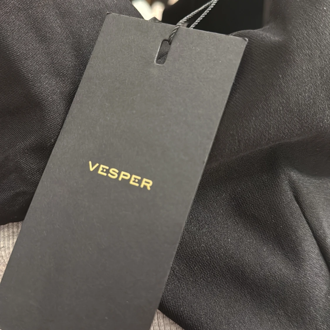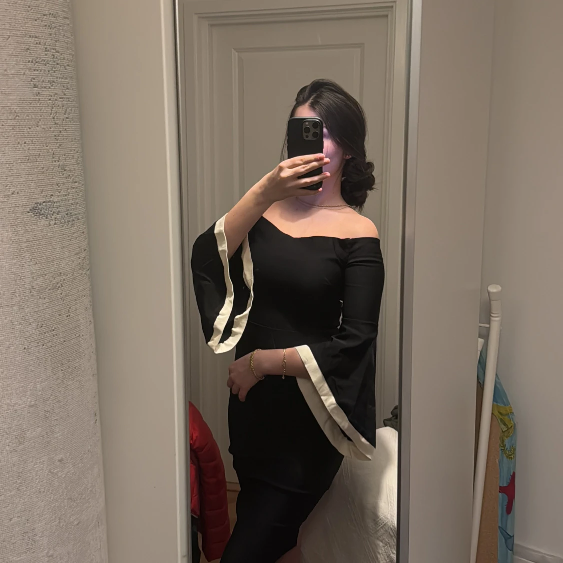 Elegant svart offshoulder midiklänning från Vesper med vita detaljer på ärmarna. Klänningen har en tight passform och trekvartsärmar, perfekt för en stilren look. Helt oanvänd med prislapp kvar. Unik, utgången modell!🌟