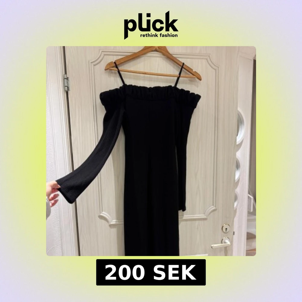Säljer en svart långklänning från H&M med offshoulder-design och smala axelband. Klänningen har långa ärmar och är tillverkad i ribbad polyester som ger en snygg struktur. Perfekt för dig som gillar stilrena och trendiga plagg. Passar från S till M