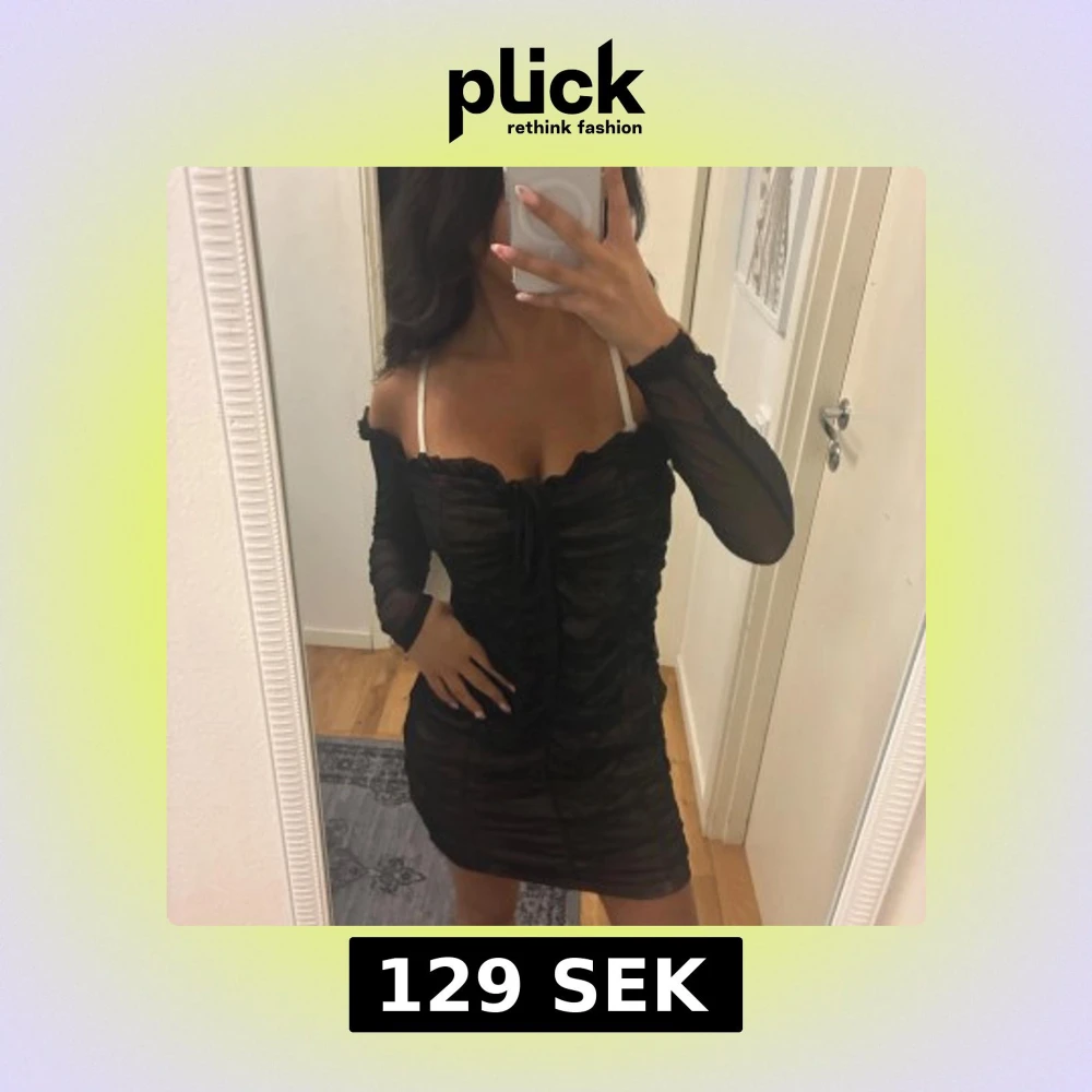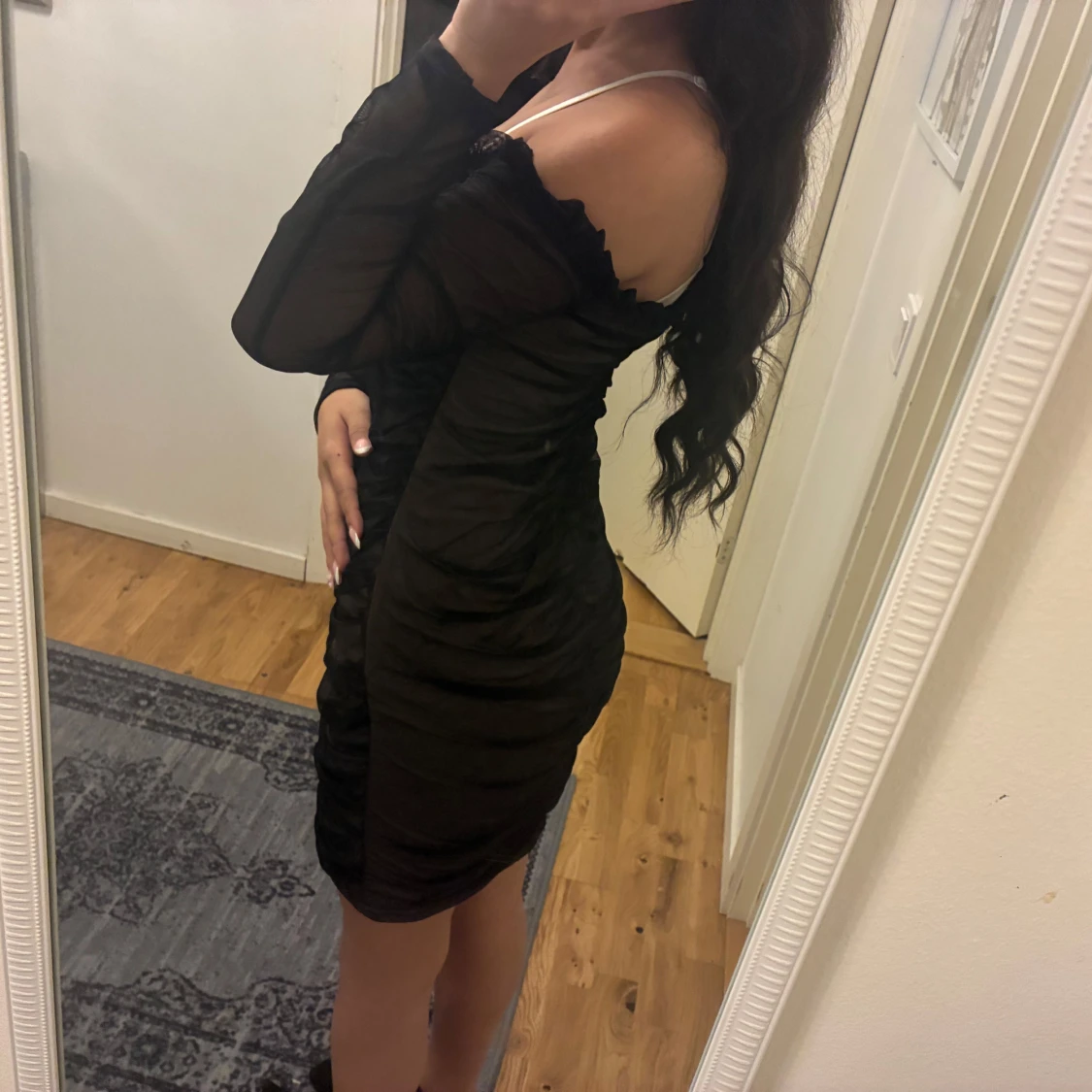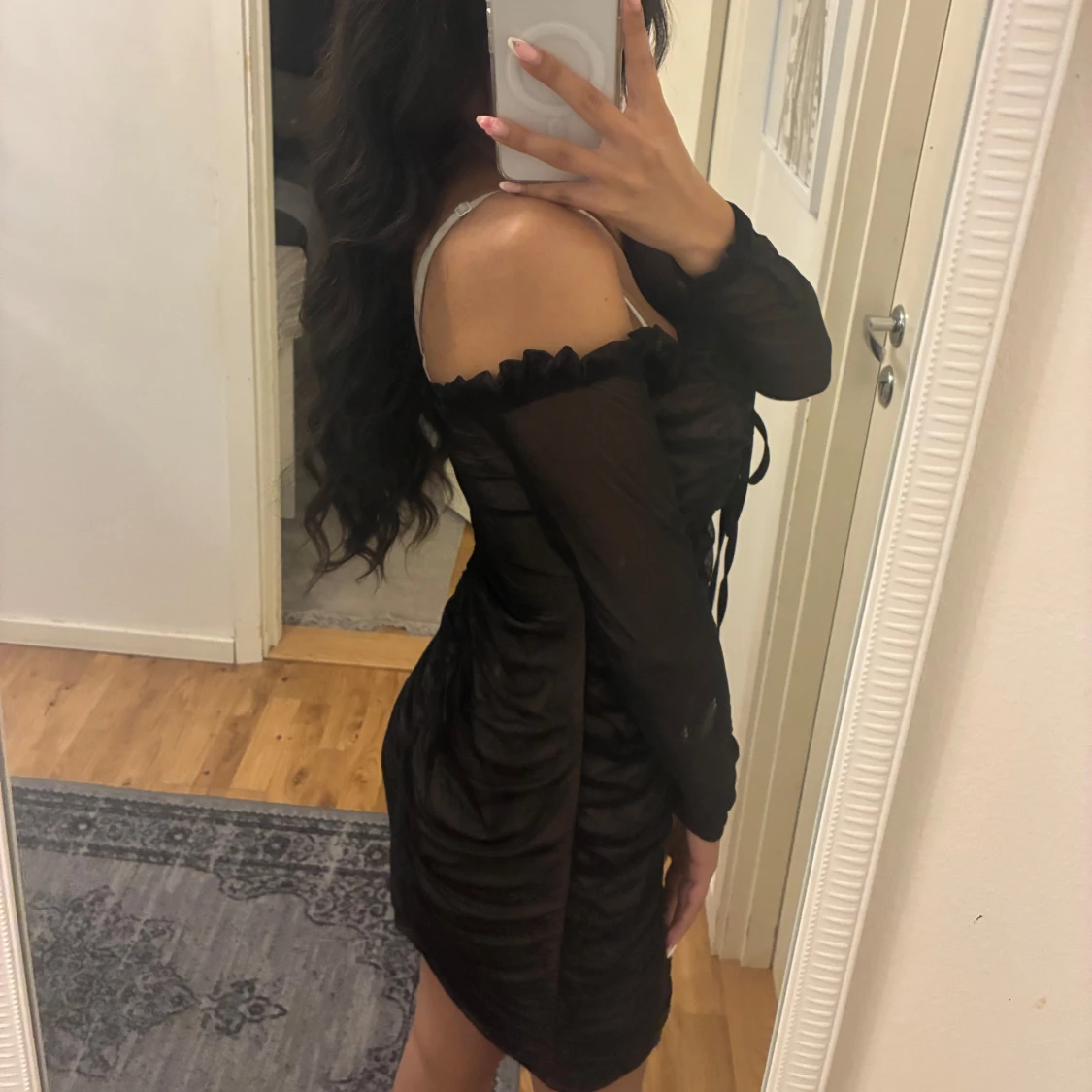 Säljer en svart kort offshoulder klänning i mesh med långa ärmar och snygg rynkad effekt framtill. Klänningen har snörning vid bysten och sitter tight för en riktigt snygg siluett. Perfekt för dig som vill sticka ut med en trendig look.