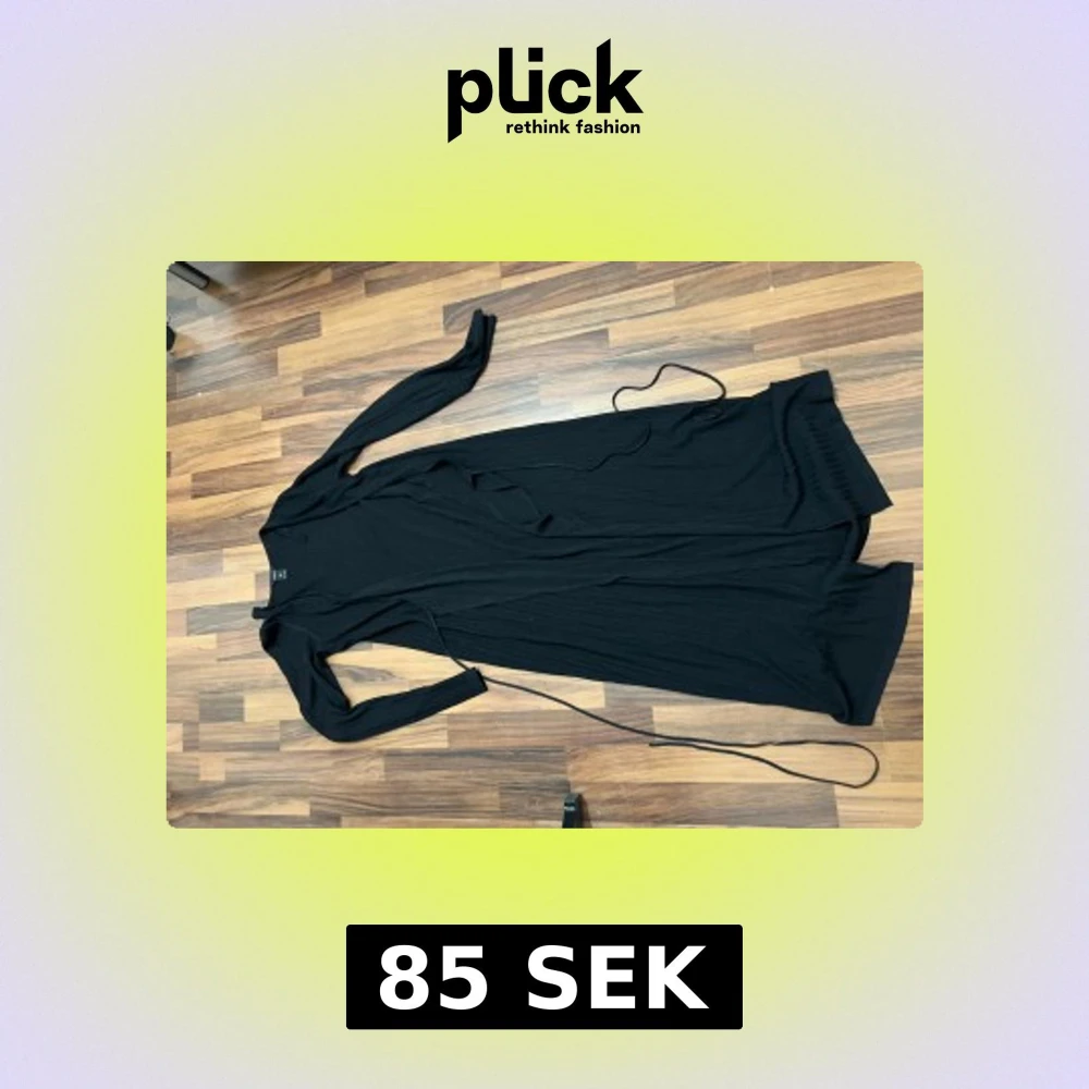 Svart lång omlottklänning från Lindex med smala ribbade ränder i tyget. Klänningen har långa ärmar och ett knytband i midjan för att skapa en snygg siluett. Materialet är mjukt och stretchigt, perfekt för dig som gillar enkel och stilren look.