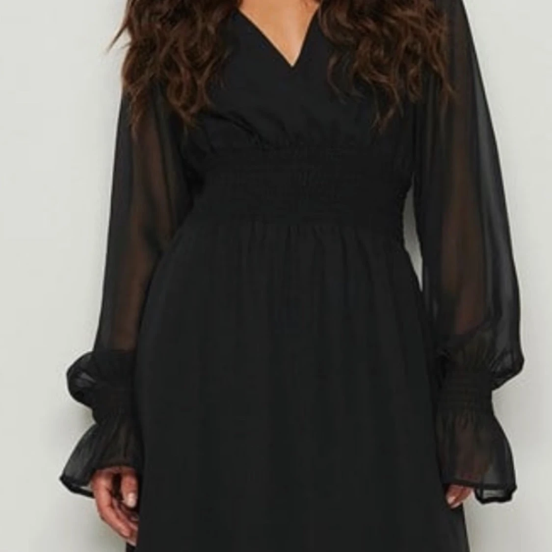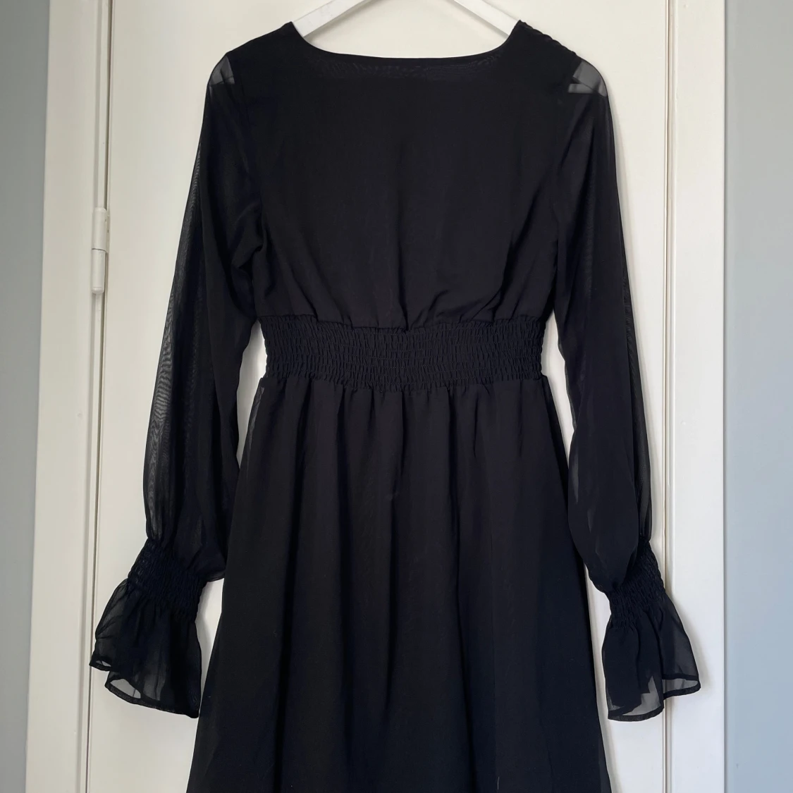 Säljer en svart omlottklänning med långa, transparenta ärmar och smock i midjan. Klänningen har v-ringning och volangdetaljer vid ärmsluten. Perfekt för dig som gillar en klassisk och stilren look.