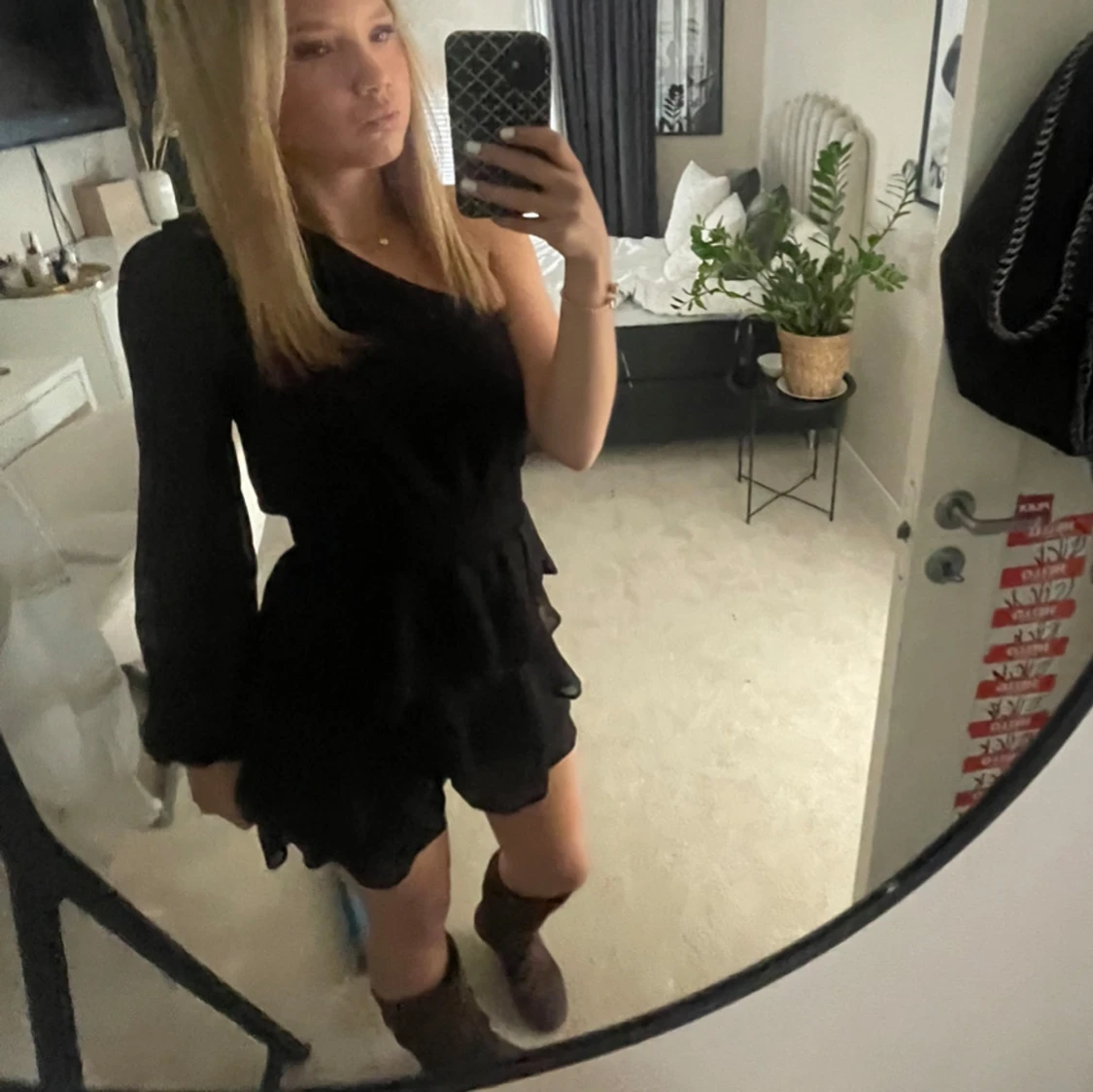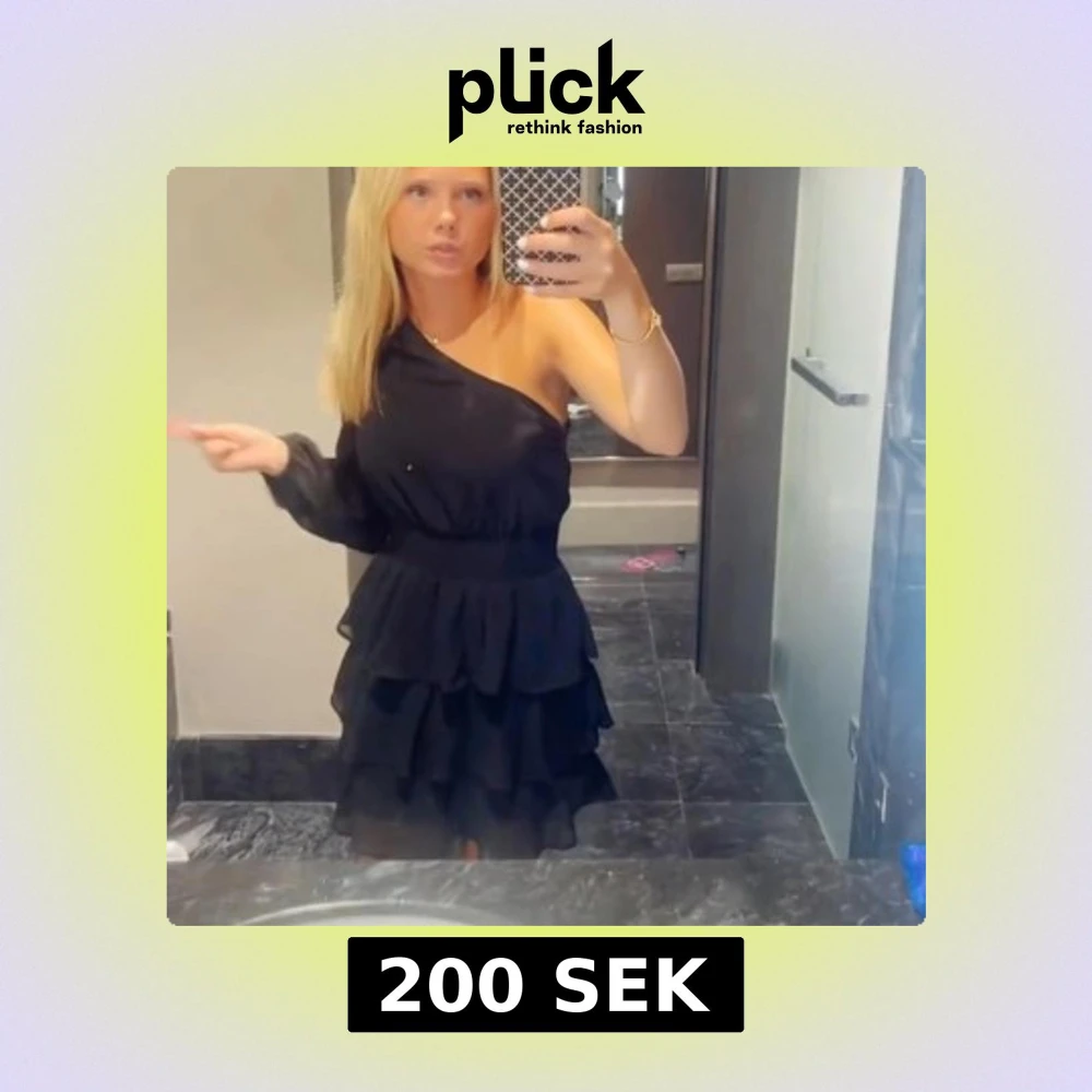 Jättte snygg svart oneshoulder klänning med volanger. Den är från Gina i storlek S. Men passar även XS. Tveka inte på att höra av dig om du vill ha fler bilder.🌸💞