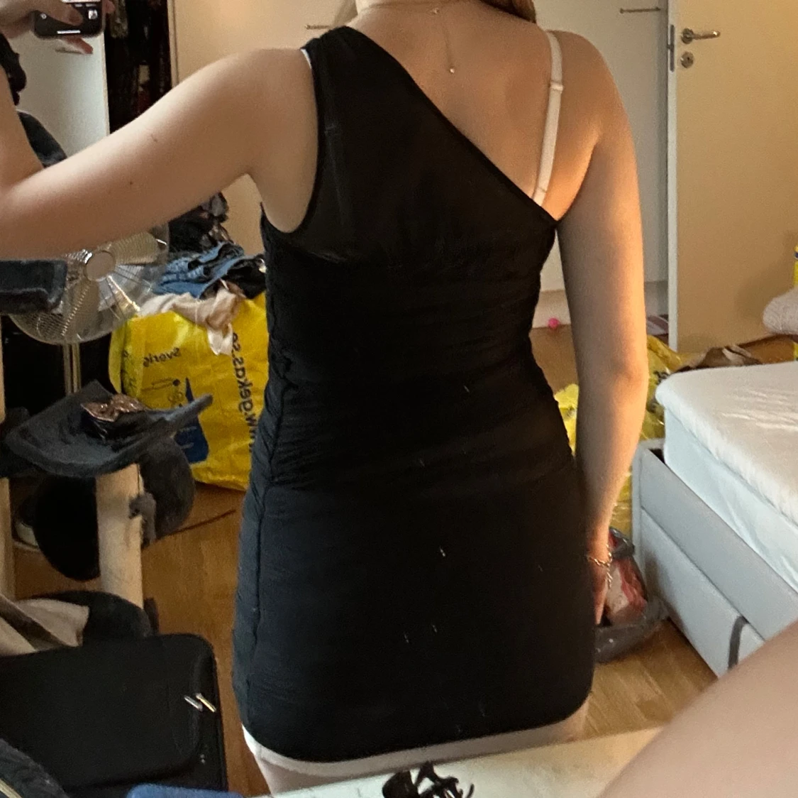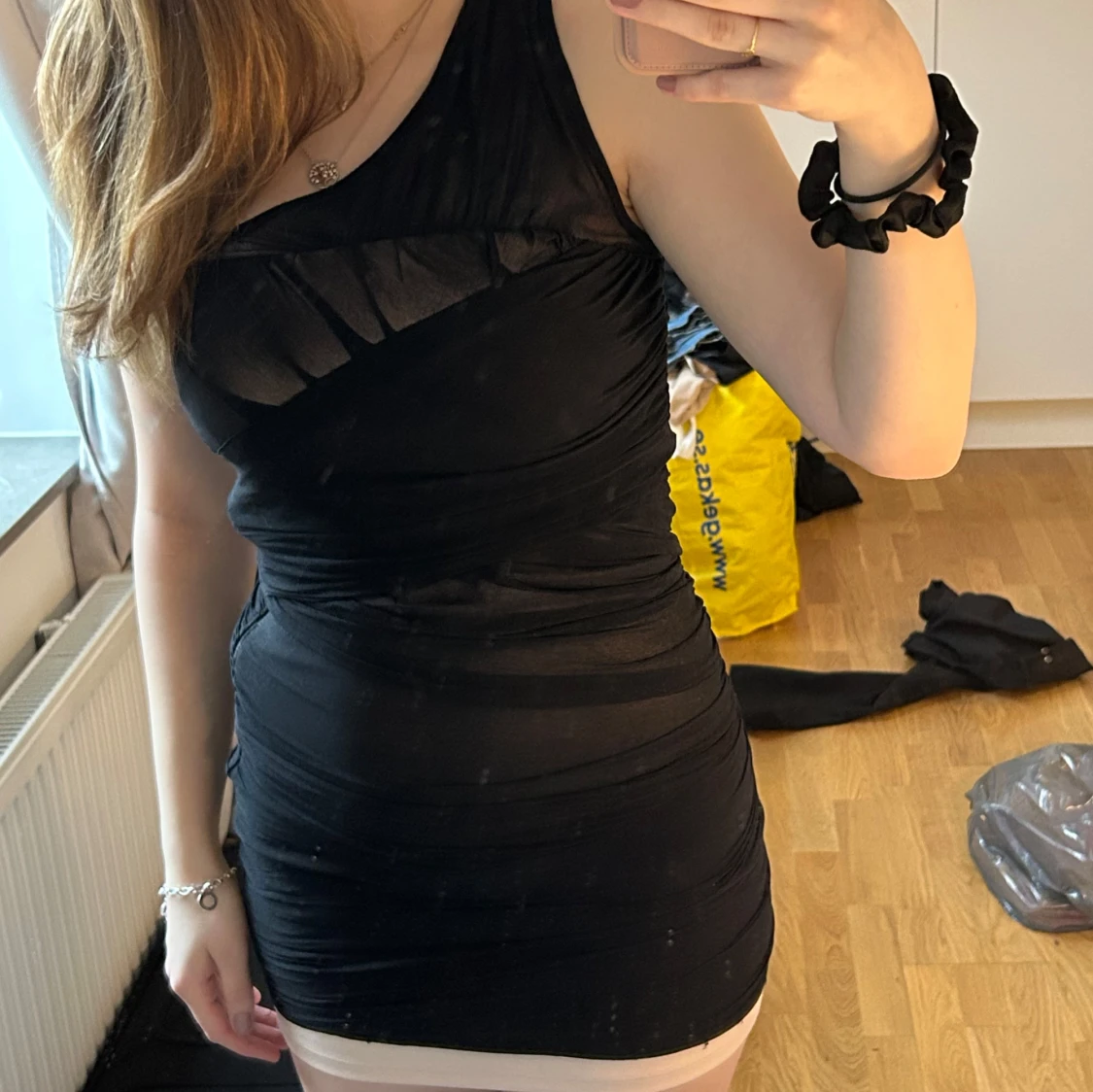 Snygg svart oneshoulder klänning från Topshop. Den har en tight passform och är perfekt för en kväll ute. Klänningen är kort och har en stilren design med en axelbandslös stil som ger en elegant touch.