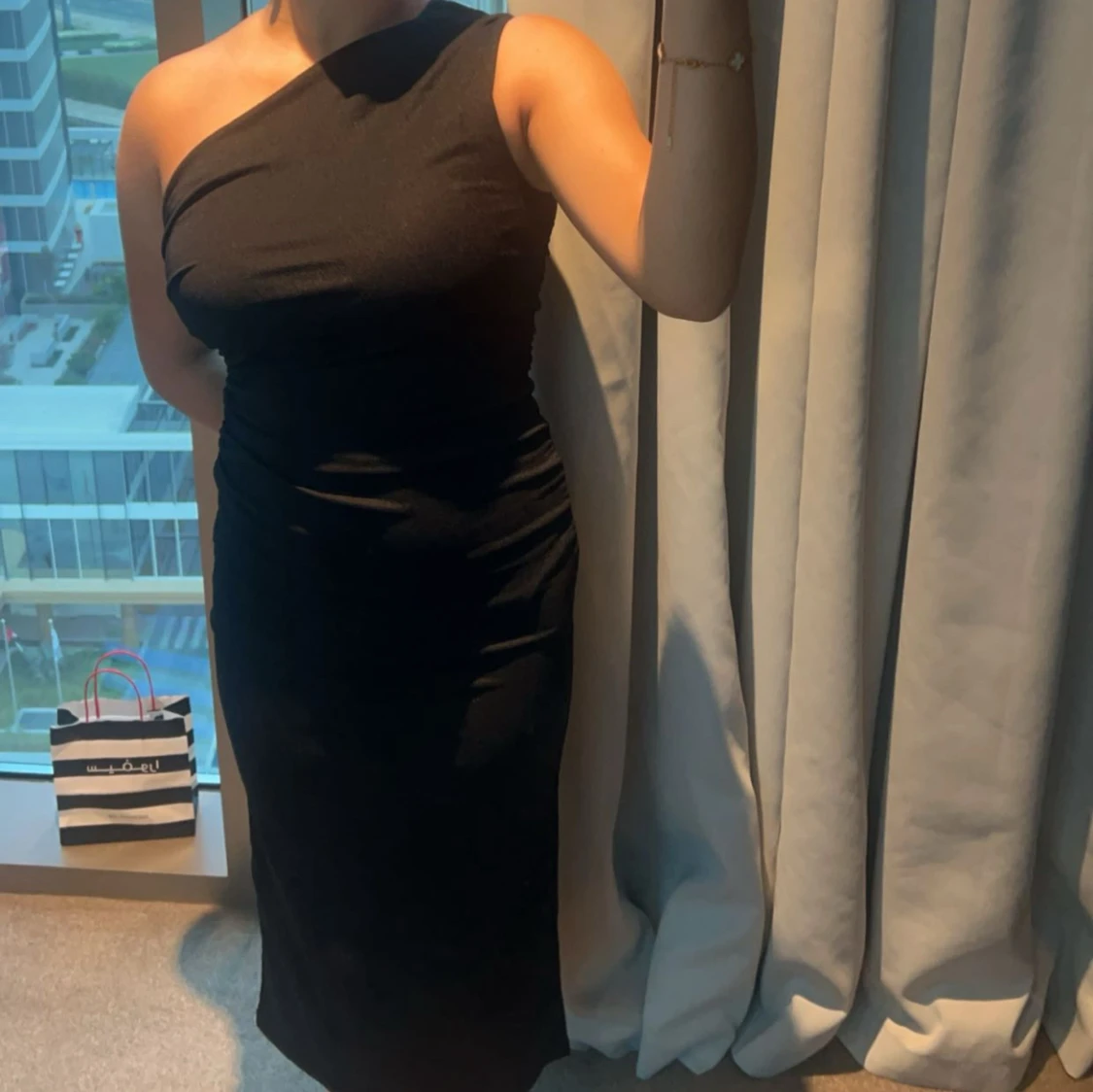 Säljer en svart långklänning med oneshoulder-design som ger en snygg och modern look. Klänningen har en tight passform och är tillverkad i ett mjukt material som sitter bekvämt mot kroppen. Perfekt för dig som vill sticka ut med en stilren och elegant outfit.