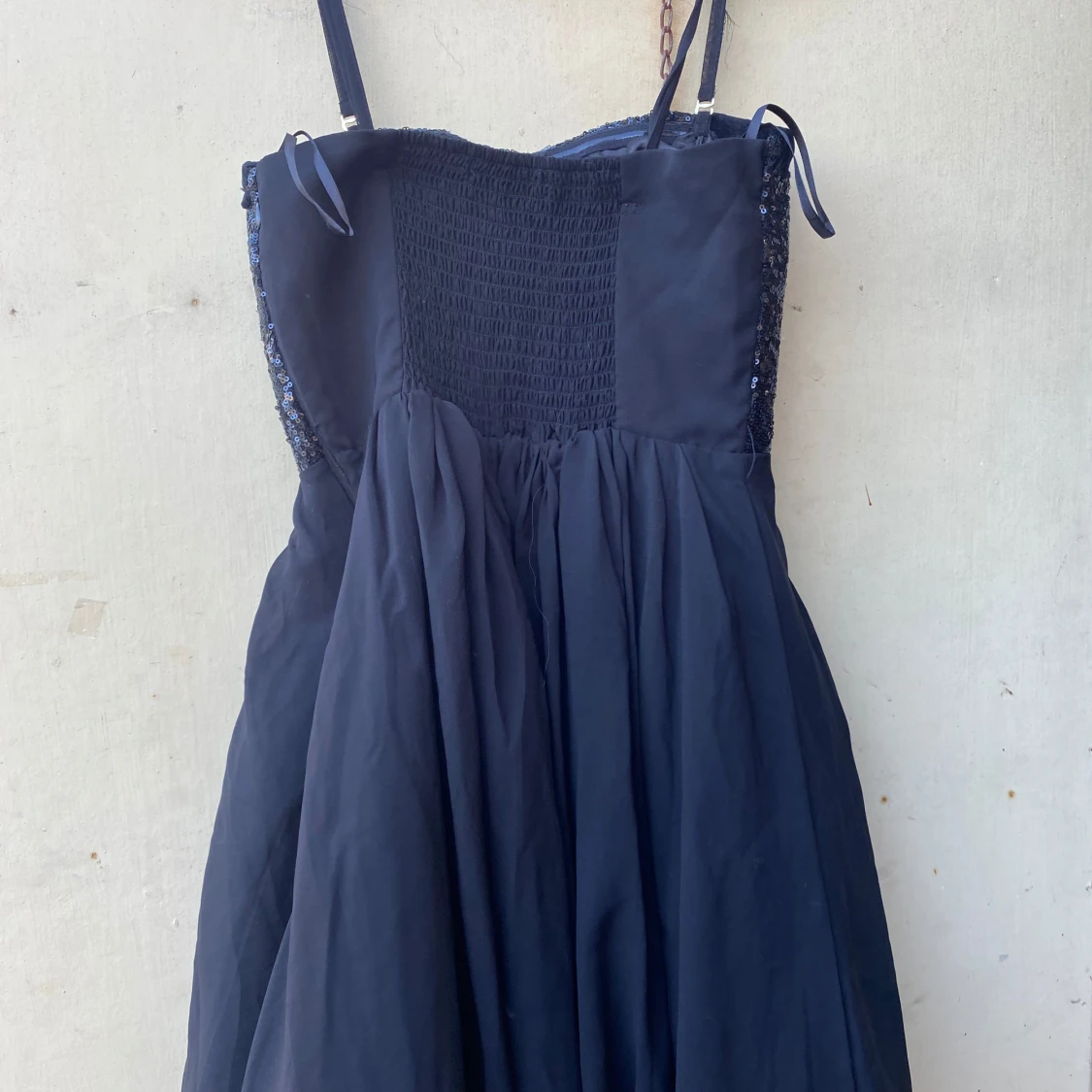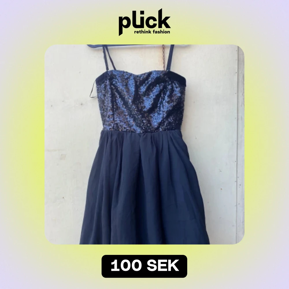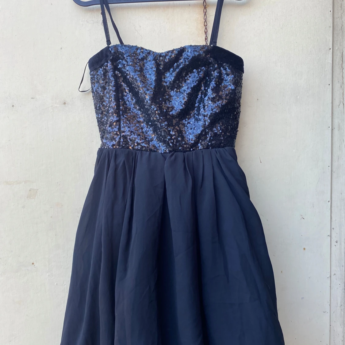 Säljer en superfin svart klänning från VILA i storlek M. Den har en glittrig paljettöverdel och en flödande kjol. Klänningen är axelbandslös med smala axelband och passar perfekt för festliga tillfällen. Den är i nyskick och redo för nästa äventyr!
