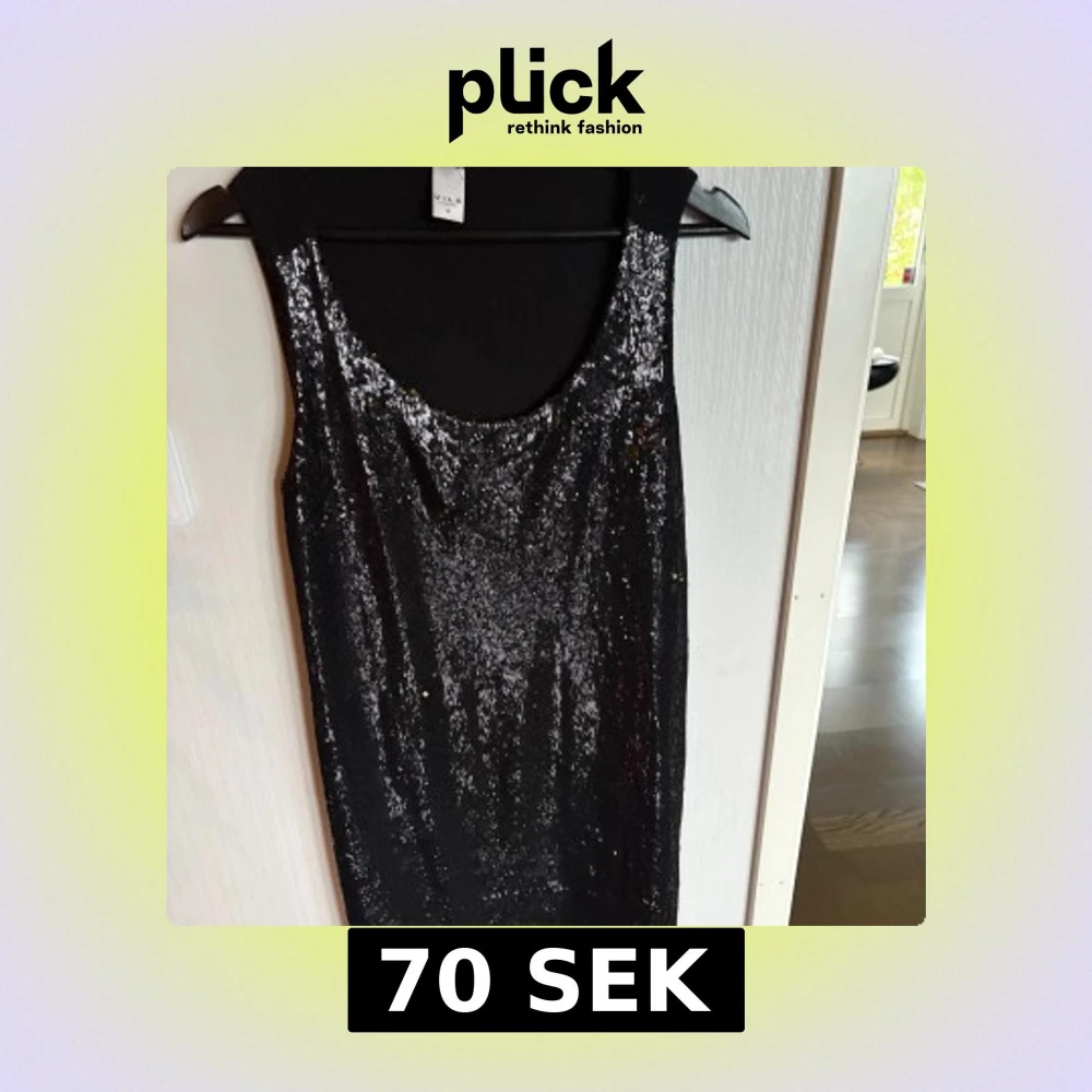 Snygg svart kortklänning från Vila med glittriga paljetter framtill. Ärmlös modell med rund halsringning och slät baksida.