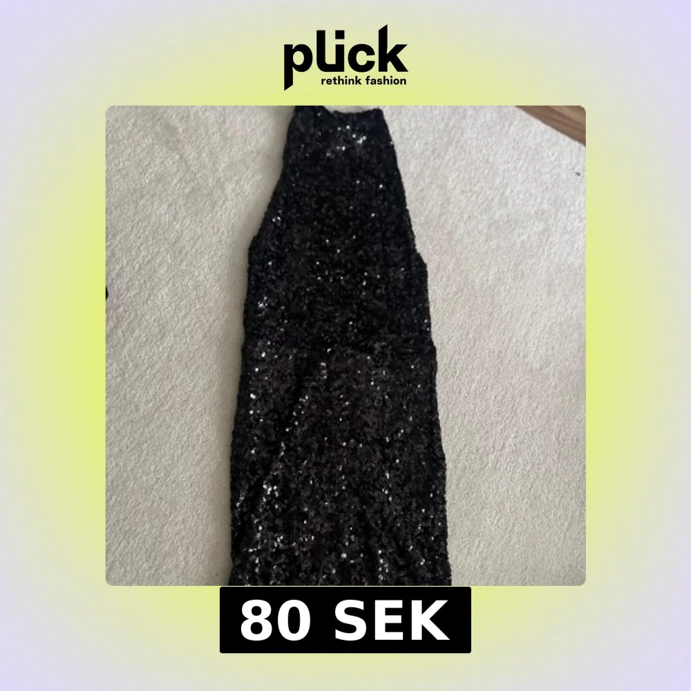 Säljer en svart långklänning täckt av glittrande paljetter. Klänningen har hög hals och är ärmlös, perfekt för att sticka ut på festen. Helt öppen i ryggen.
