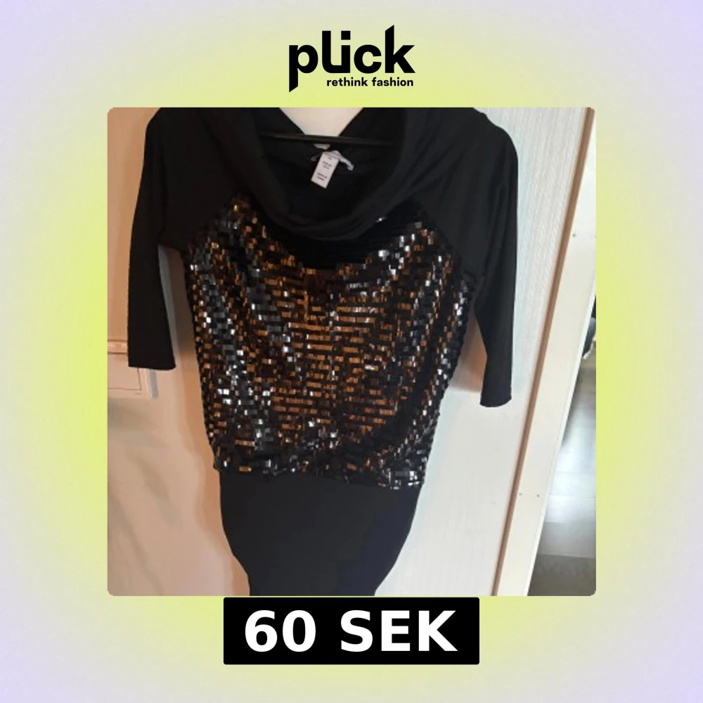 Snygg svart kortklänning med glittriga paljetter framtill och trekvartsärm. Klänningen har en lösare krage och är figurnära nertill.