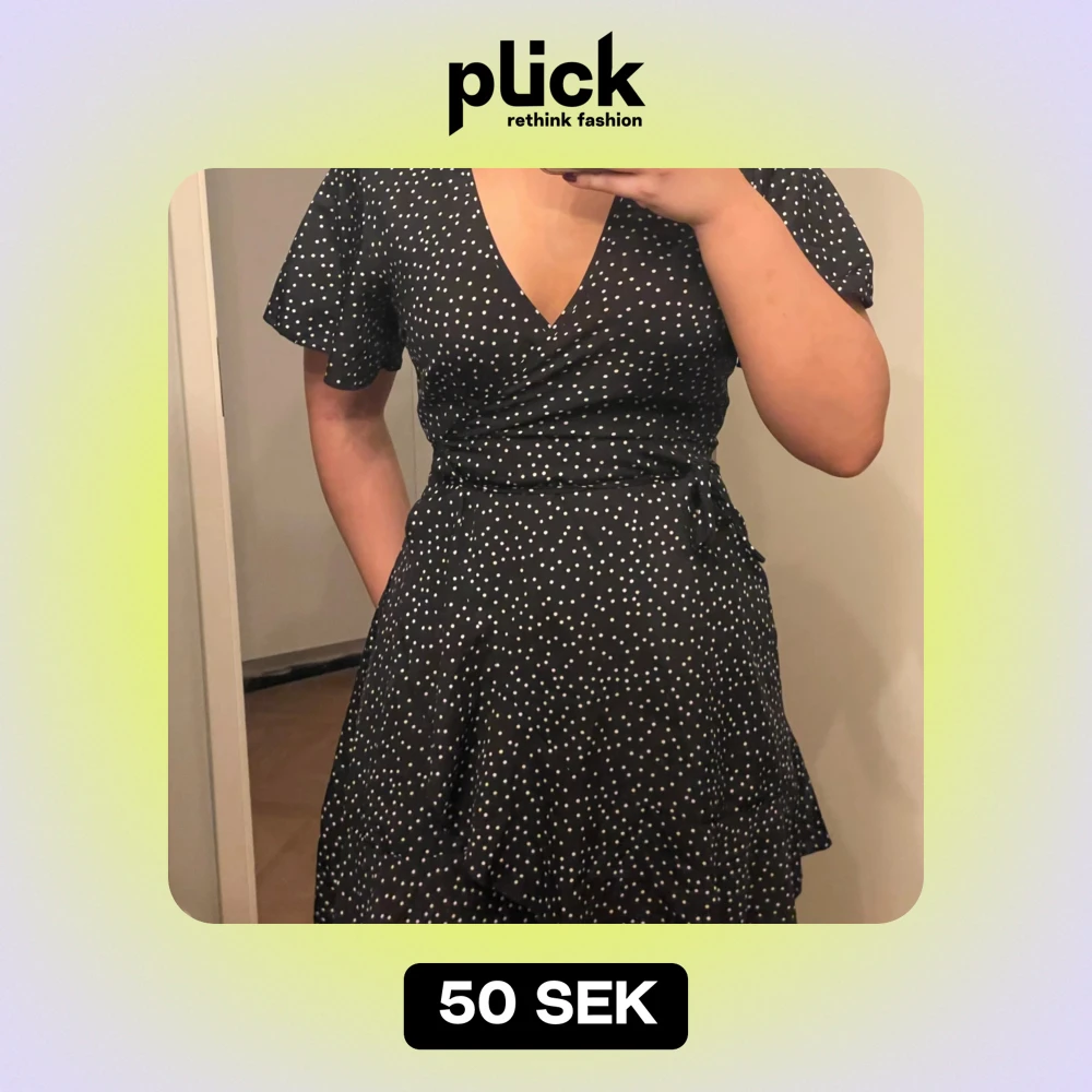Säljer en superfin svart klänning med vita prickar. Den har en v-ringad omlott-design och korta ärmar. Perfekt för både vardag och fest! Klänningen har en smickrande passform och är i mycket bra skick.
