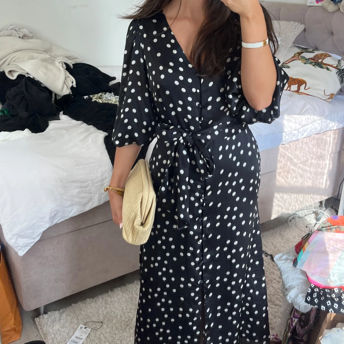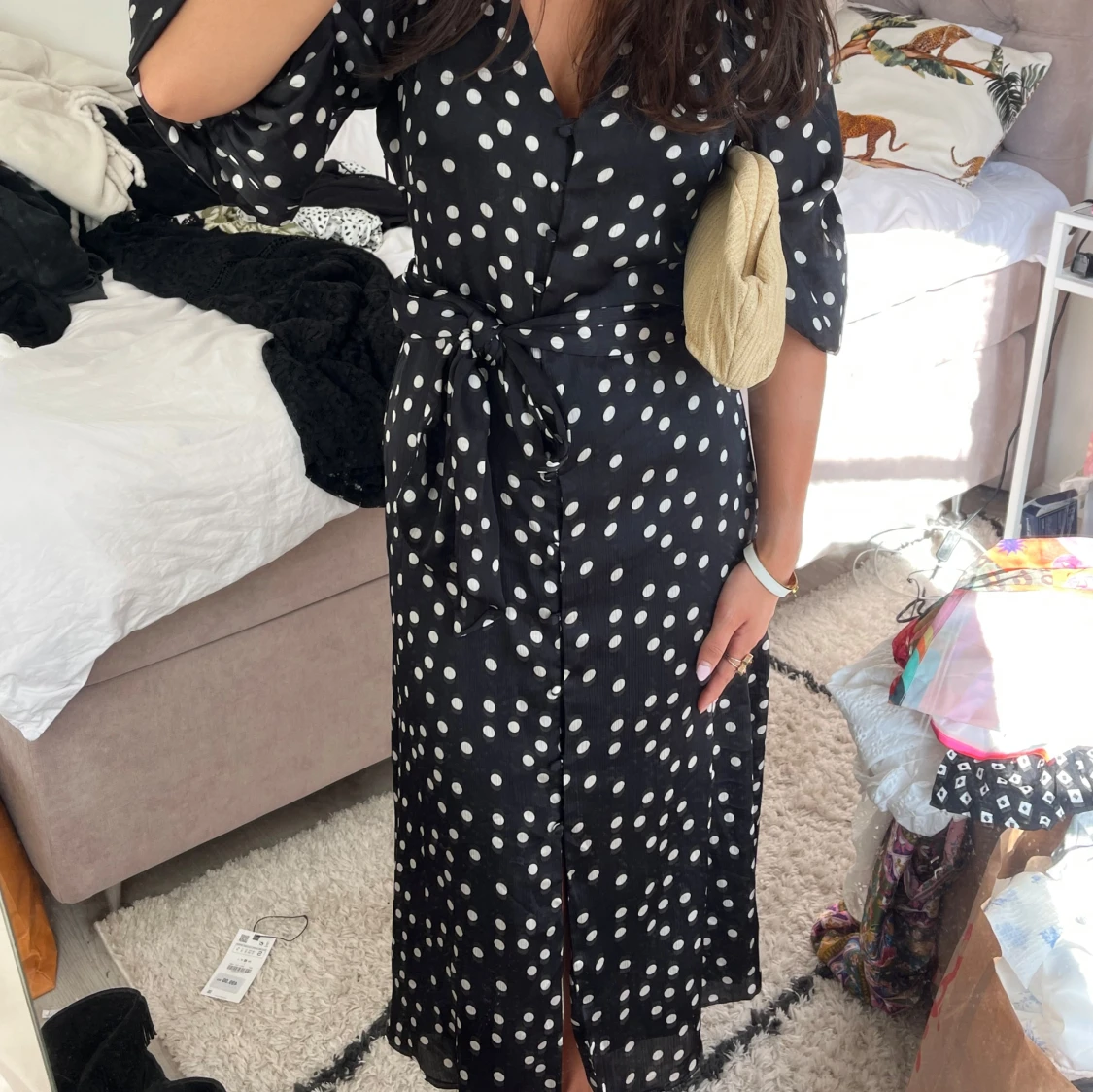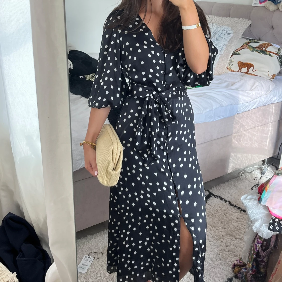 Supersnygg svart långklänning med vita prickar och v-ringning. Klänningen har trekvartsärmar, knappar framtill och ett matchande knytbälte i midjan. Materialet känns lätt och flowy, perfekt för en trendig look.