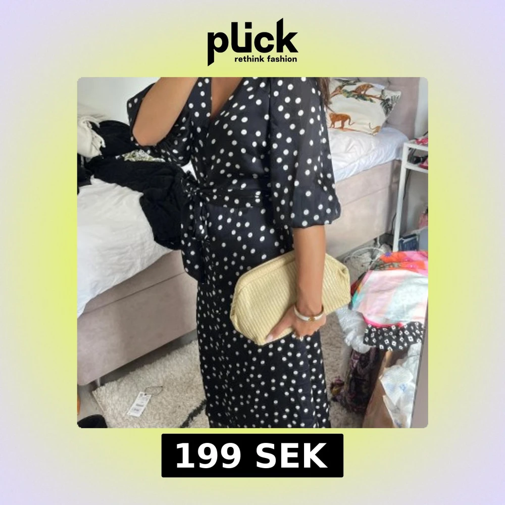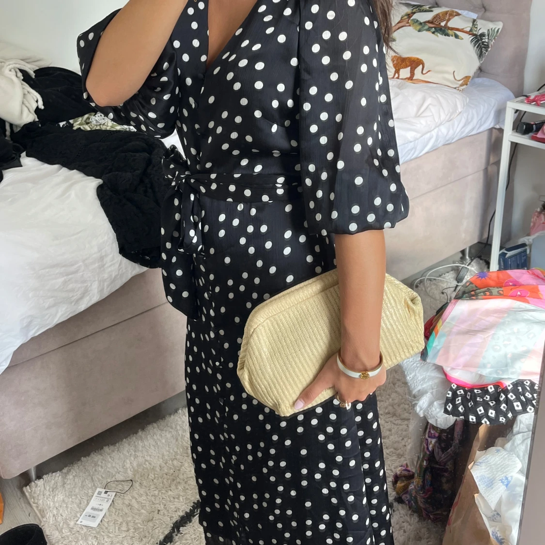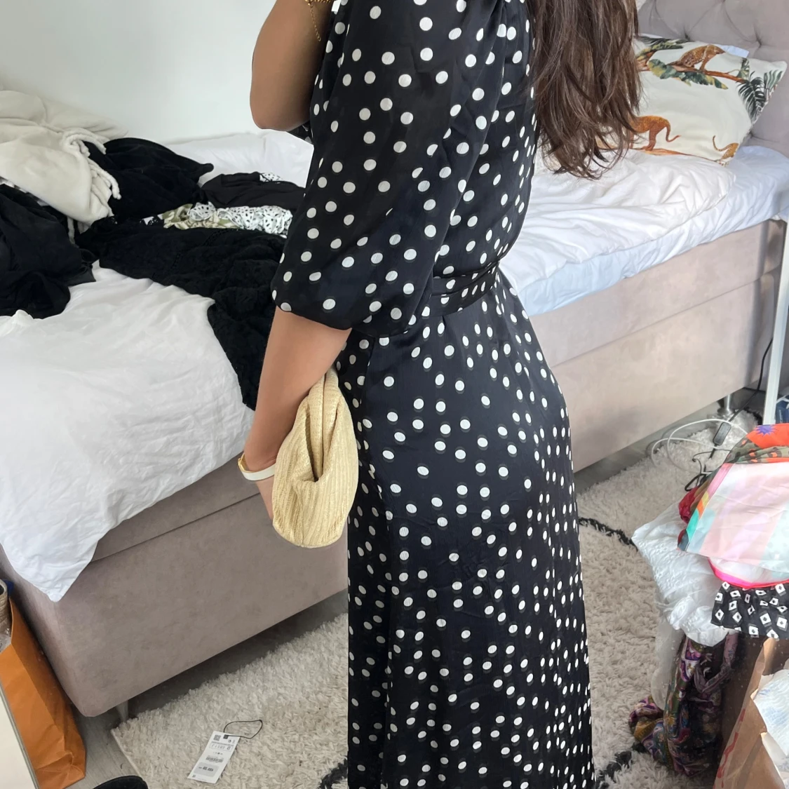 Supersnygg svart långklänning med vita prickar och v-ringning. Klänningen har trekvartsärmar, knappar framtill och ett matchande knytbälte i midjan. Materialet känns lätt och flowy, perfekt för en trendig look.
