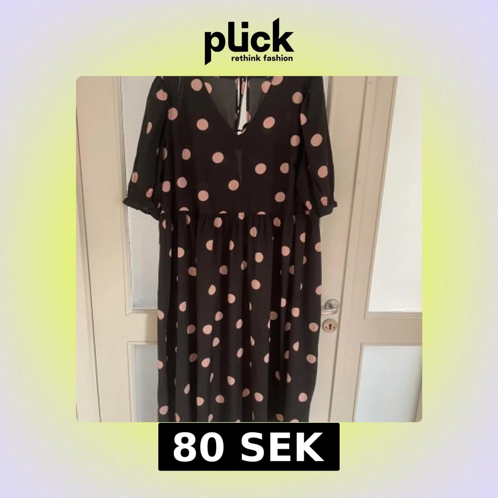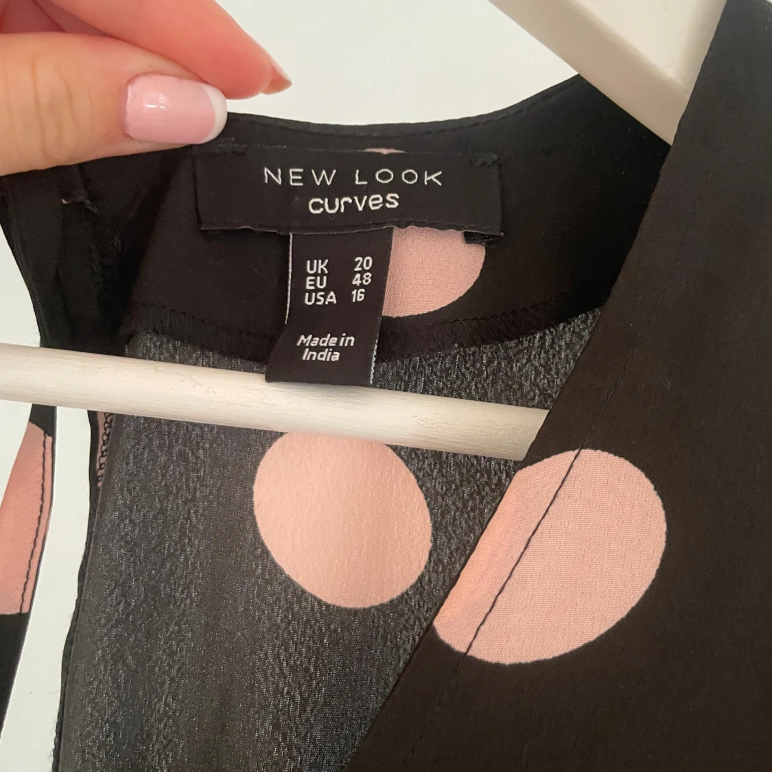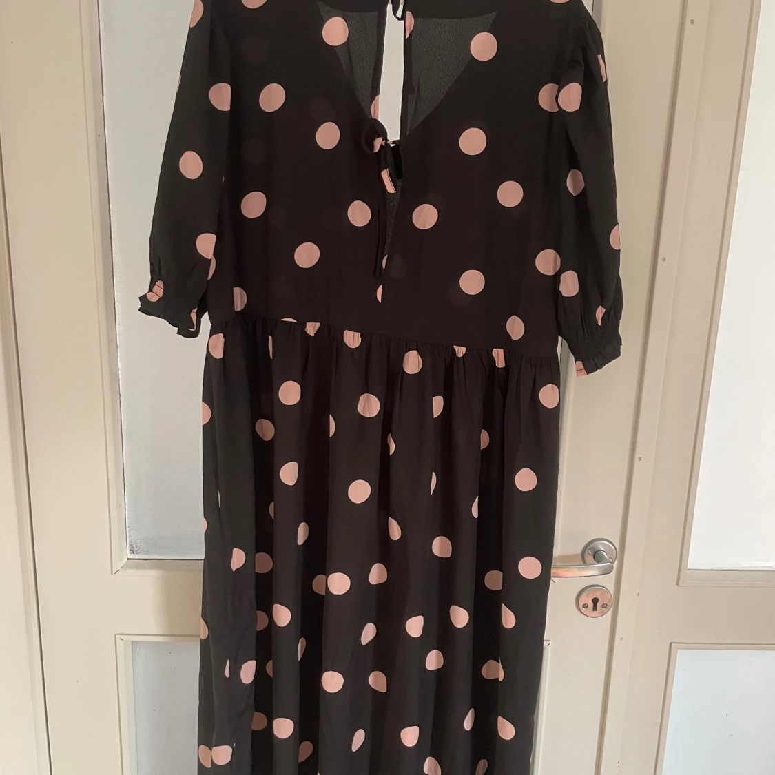 Svart långklänning från New Look Curves med stora ljusrosa prickar. Klänningen har v-ringning, knytning i ryggen och halvlånga puffärmar med resår. Tillverkad i ett lätt och luftigt syntetmaterial som ger ett flowigt fall.