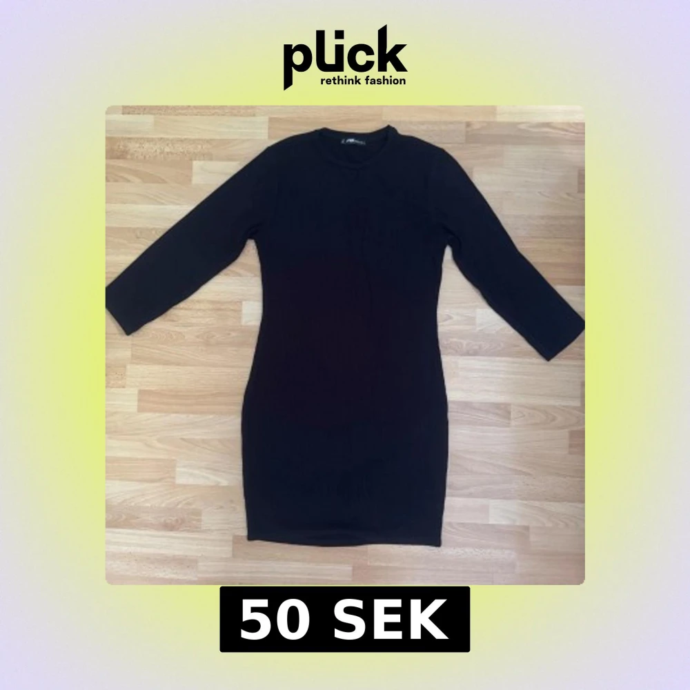 En svart, ribbad klänning från FB Sister i storlek XL. Modellen är kort med trekvartsärm och har en rund halsringning. Klänningen har en slim passform som framhäver figuren och är tillverkad i mjuk bomull för en bekväm känsla. Förminskad och är som M. Bröst 90cm. Sydde upp ärmarna till trekvart längd.