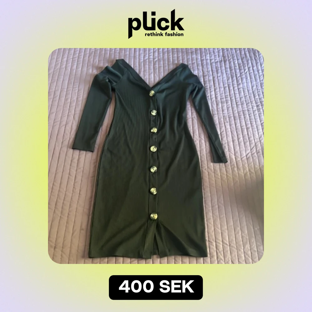 Säljer en elegant svart ribbad klänning från Gina Tricot. Den har en v-ringad design med knappar hela vägen ner och långa ärmar. Perfekt för både vardag och fest!