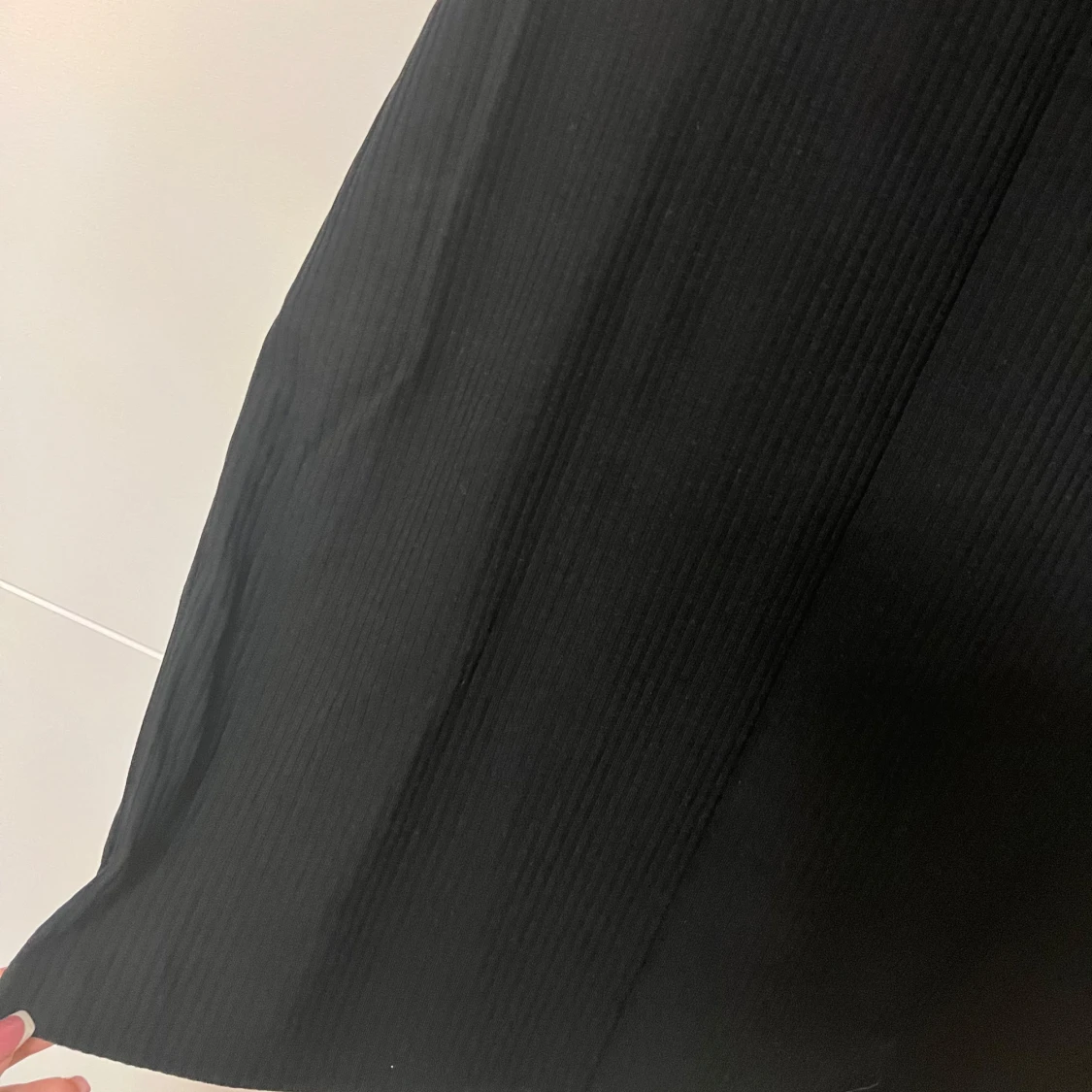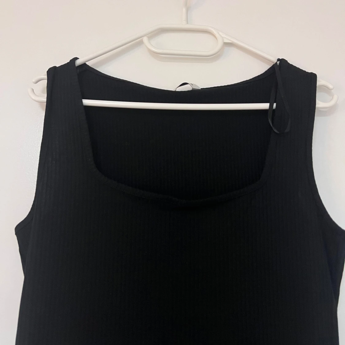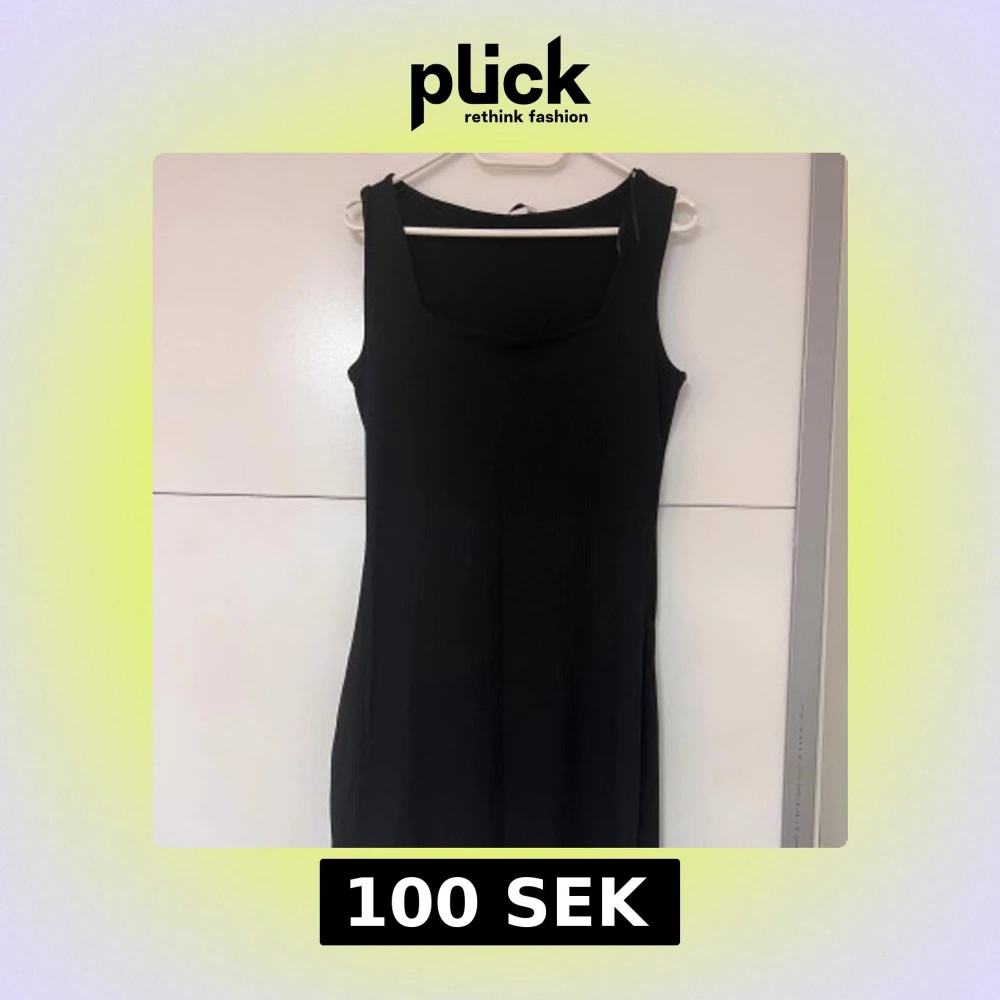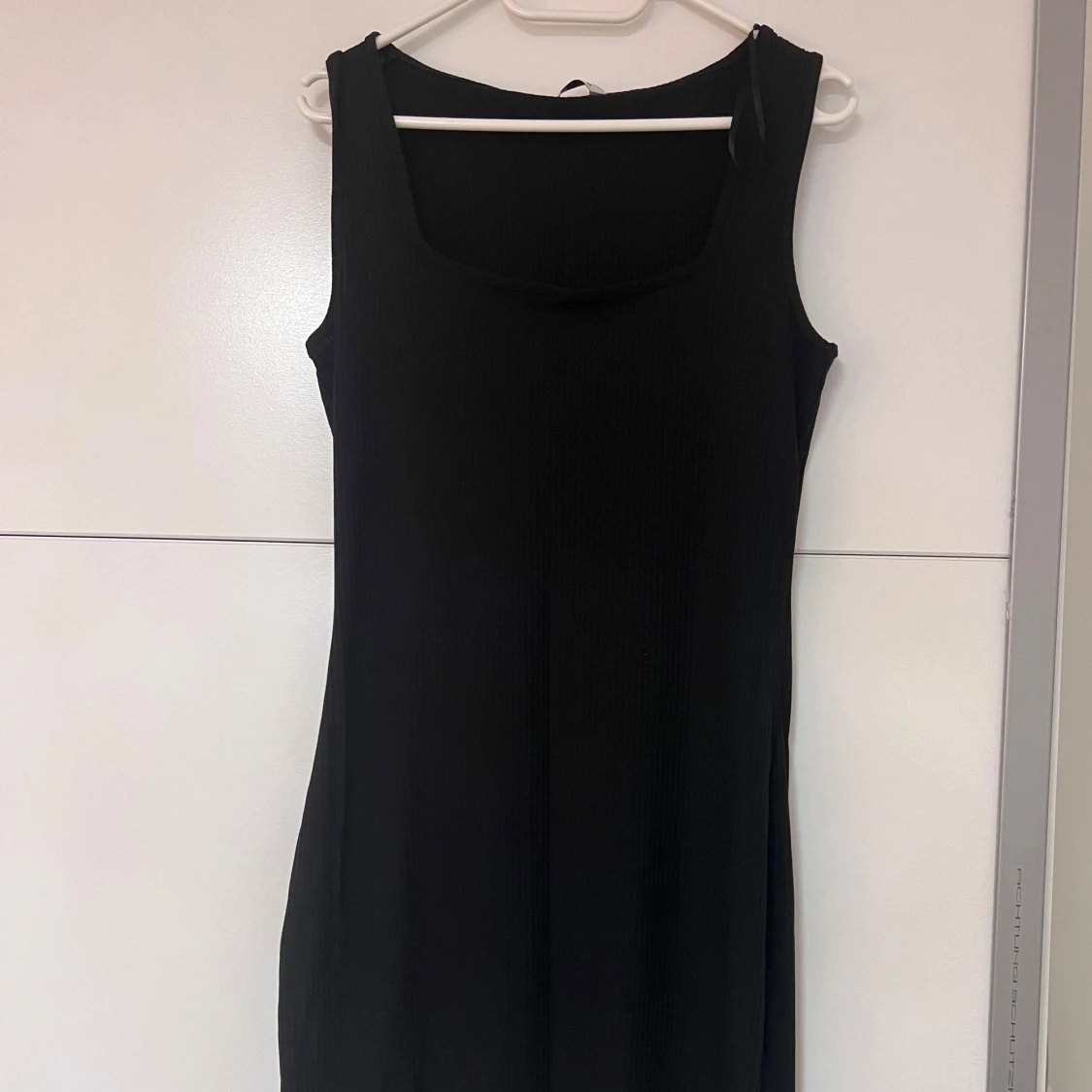 En svart, ärmlös långklänning med ribbad struktur och fyrkantig ringning. Klänningen har en enkel och stilren design som gör den lätt att styla.