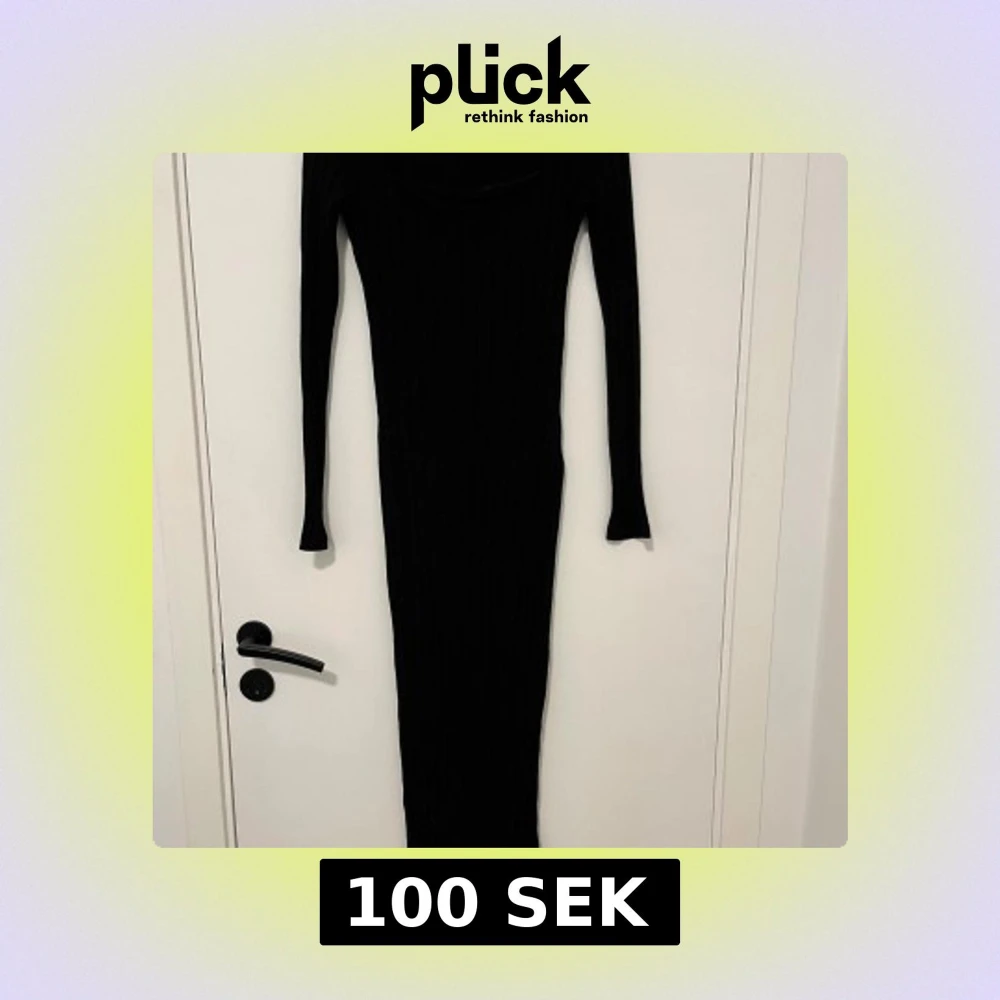 Säljer en svart långklänning med ribbad struktur och lång ärm. Klänningen har en snygg, fyrkantig urringning och sitter tight mot kroppen. Perfekt för dig som gillar minimalistisk och stilren look.