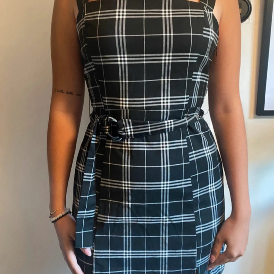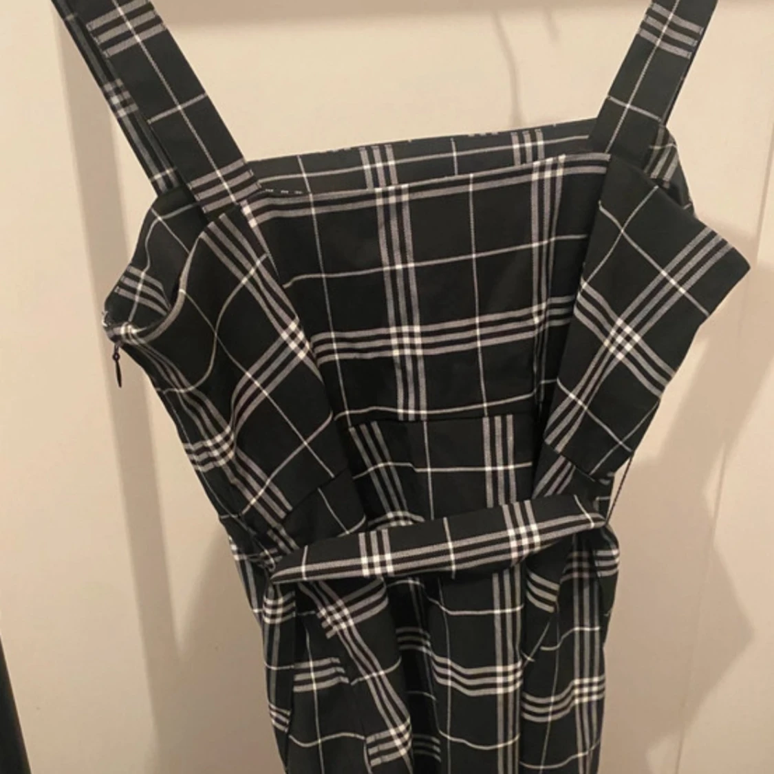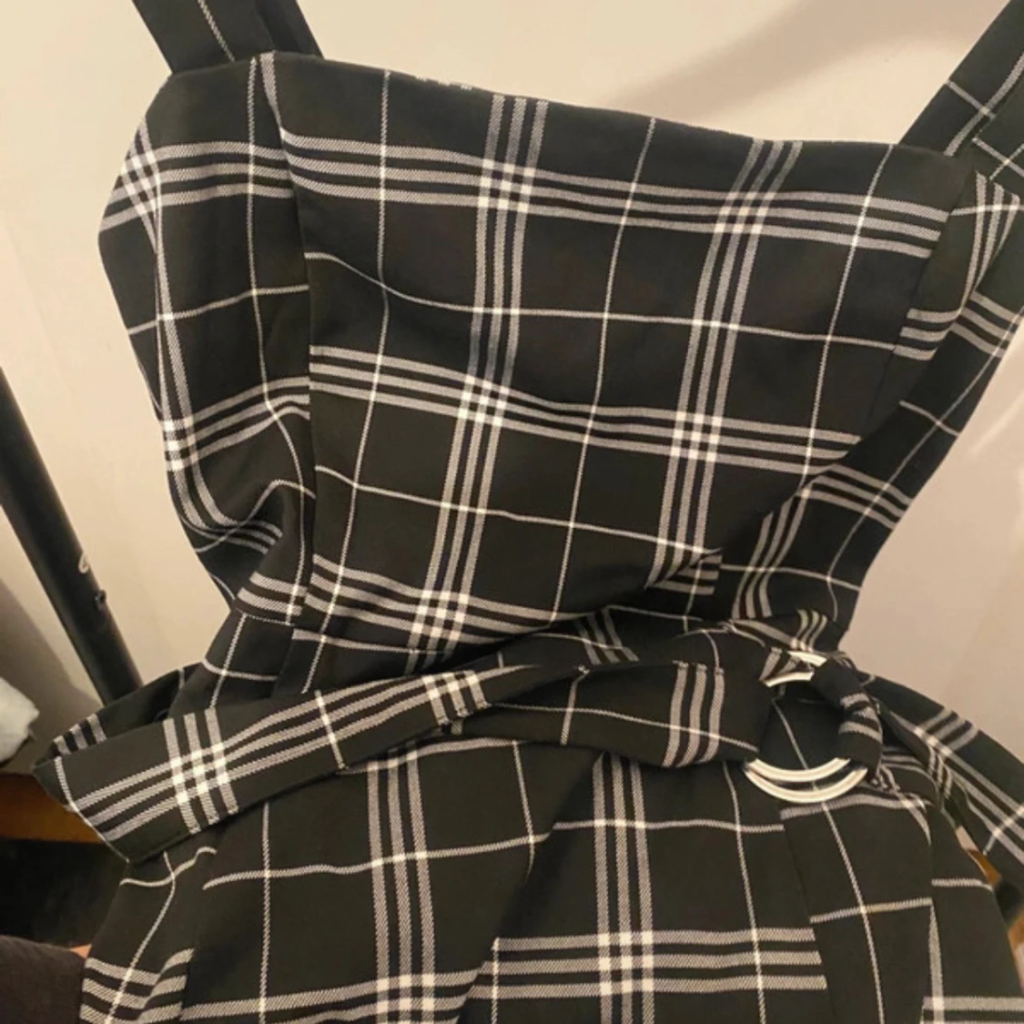 Snygg svart klänning med vita rutor och breda axelband. Modellen är kort och har ett matchande tygbälte i midjan som knyts med metallring. Passformen är normal och klänningen har en stilren, modern look som funkar till många tillfällen.