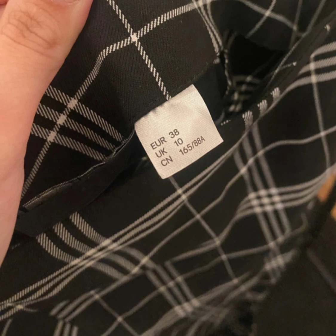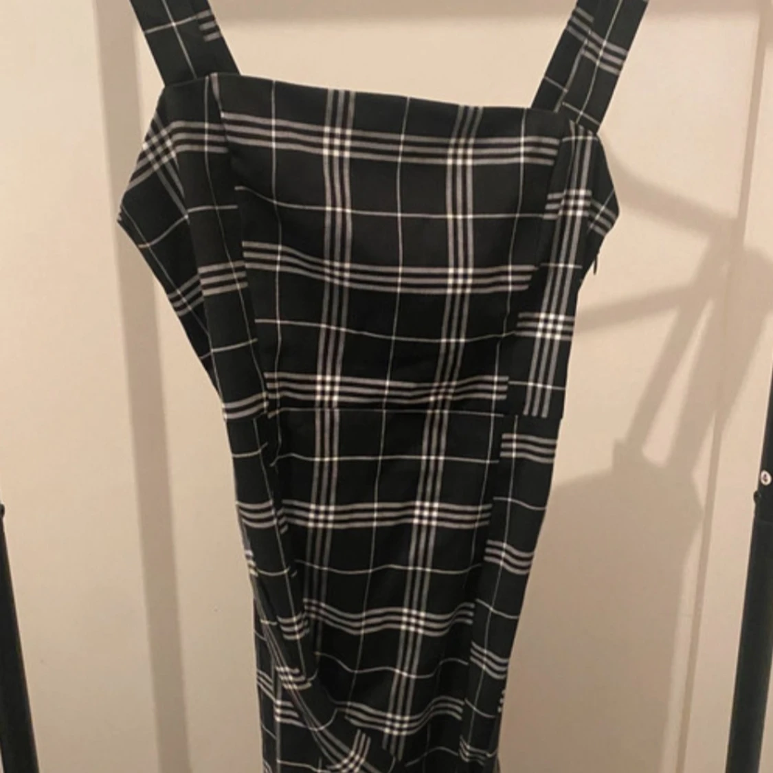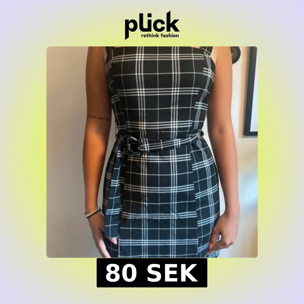 Snygg svart klänning med vita rutor och breda axelband. Modellen är kort och har ett matchande tygbälte i midjan som knyts med metallring. Passformen är normal och klänningen har en stilren, modern look som funkar till många tillfällen.