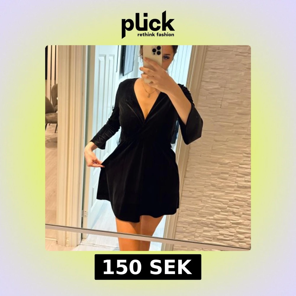 Elegant svart klänning i mjuk sammet med omlott-design och v-ringning. Klänningen har långa ärmar med volangdetaljer och en kort längd som ger en stilren look. Passar perfekt för s/m/l storlek