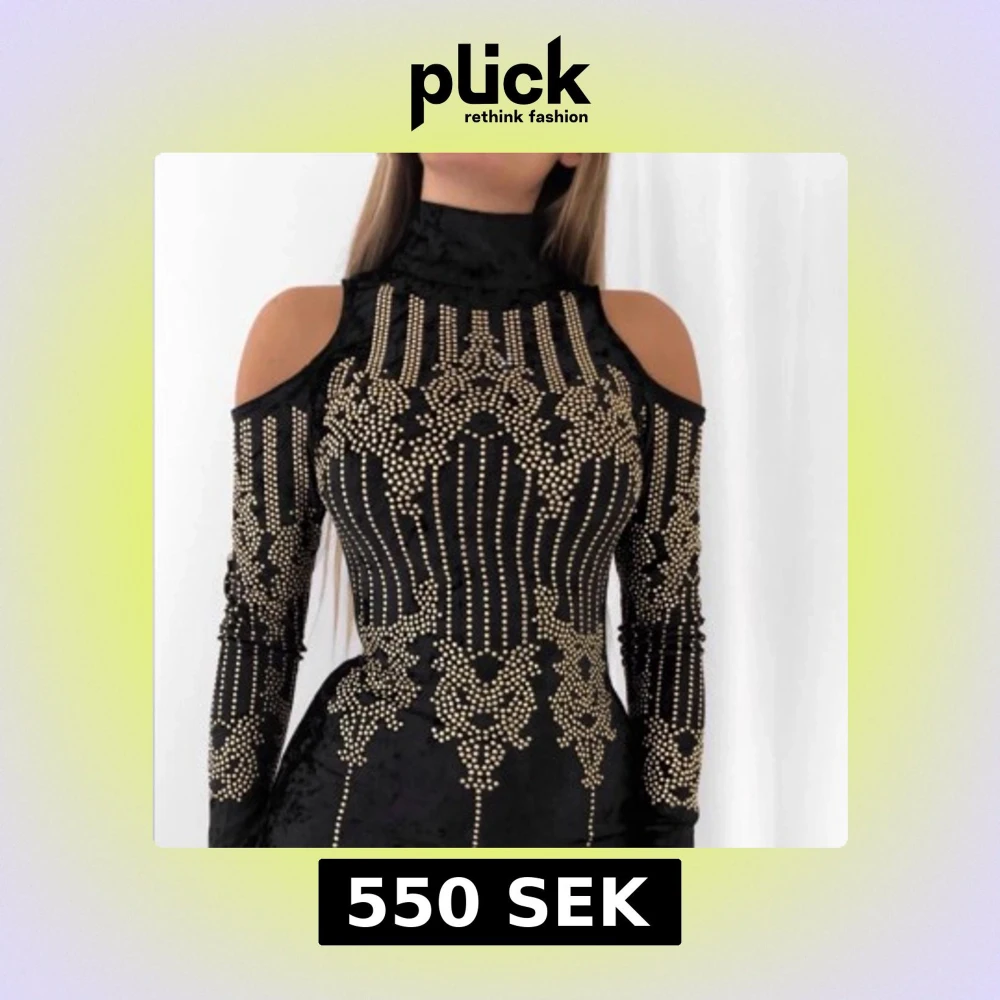 DM ”viva dress”. Supersnygg svart sammetsklänning med tight passform och coola cut out-detaljer vid axlarna. Klänningen har långa ärmar och är täckt av glittriga guldfärgade nitar i ett unikt mönster. Perfekt för dig som vill sticka ut och glänsa.