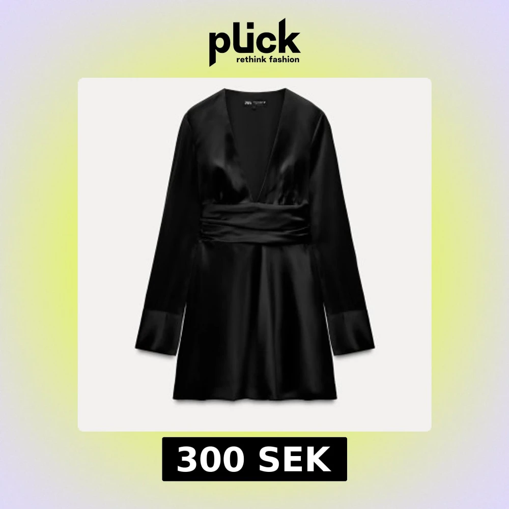 Supersnygg svart kortklänning i satin från Zara med djup v-ringning och långa ärmar. Klänningen har markerad midja och en elegant, glansig finish som ger en lyxig känsla.