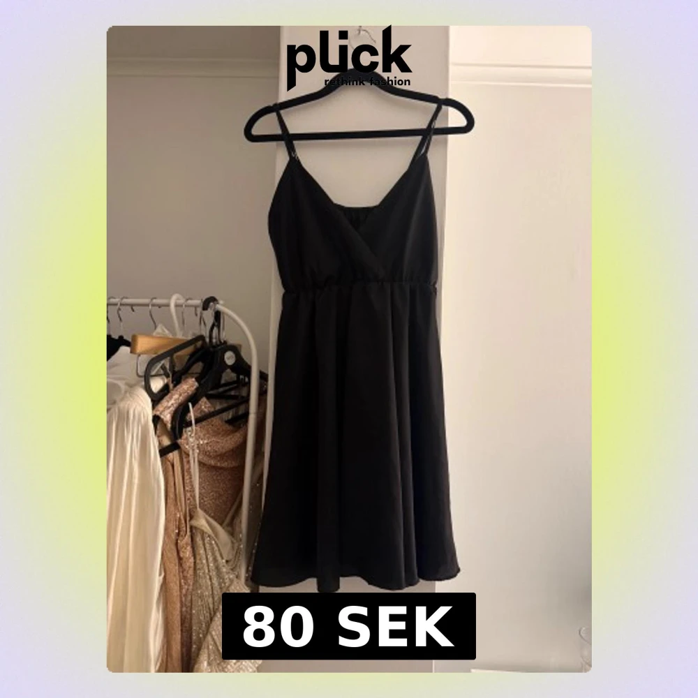 En svart kortklänning i satin och smala axelband. Klänningen har en markerad midja och ett lätt utställt kjolparti.