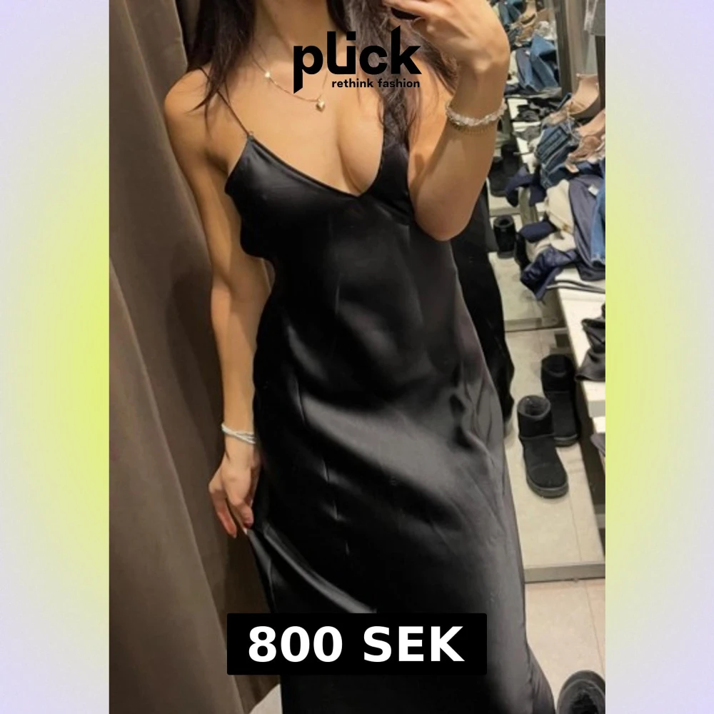 Säljer en svart långklänning i satinliknande material med tunna axelband och djup v-ringning. Klänningen har en elegant öppen rygg. Har lite små tecken på användning (se bild) annars väldigt gott skick då den endast används 2 gånger. Från Zara