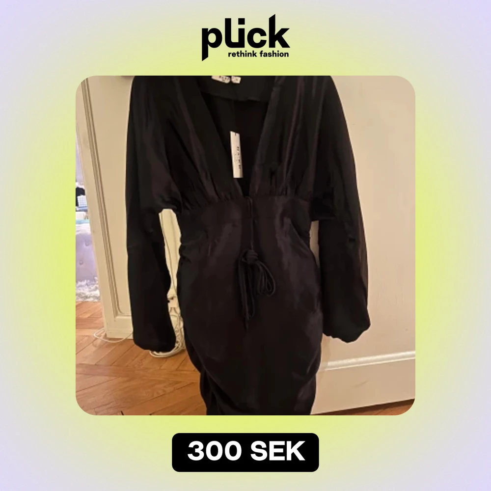 Svart, kort satinklänning som är helt oanvänd+ lapp kvar. En åtsittande passform på nedre delen av klänningen. Riktig snygg!! i storlek xs men kan även passa S