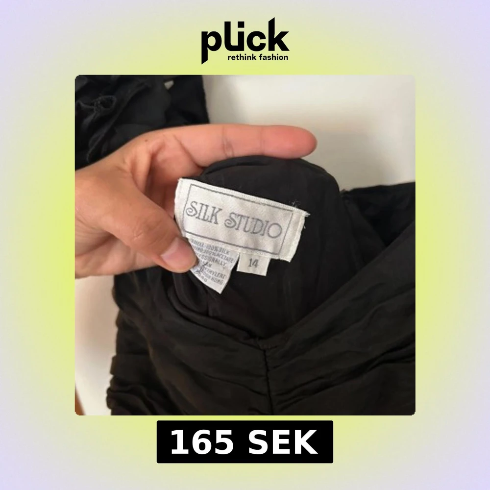 Supersnygg svart kortklänning i 100% silke från Silk Studio. Klänningen har v-ringning, rynkade detaljer och axelband med stora blommiga volanger. Sitter figurnära och ger en elegant siluett, perfekt för dig som vill sticka ut.