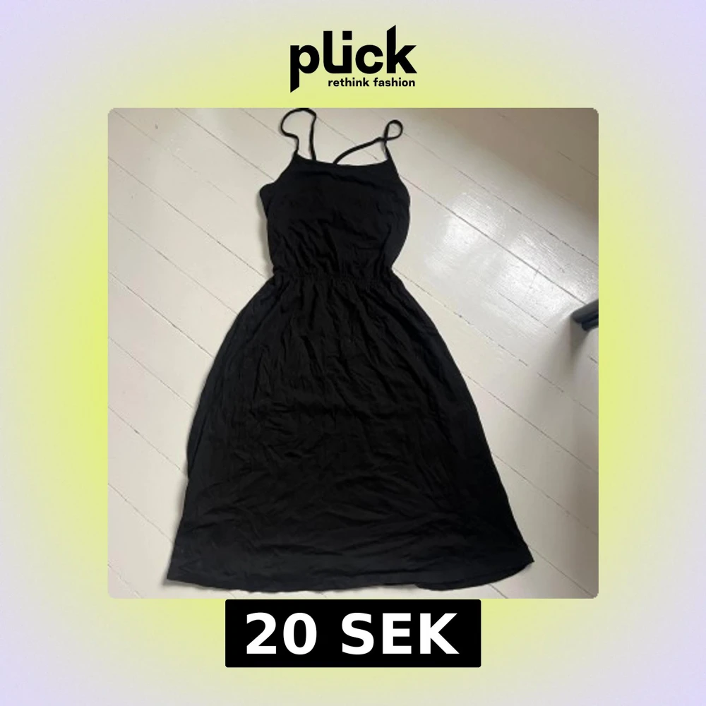 En enkel svart klänning med smala axelband korsade i ryggen och resår i midjan. Klänningen är ärmlös och har en luftig passform, perfekt för varma dagar. Kan användas till stranden eller som en vanlig vardagsklänning. Längden är mellan knä och vad. Knappt använd. Skriv för fler bilder💞