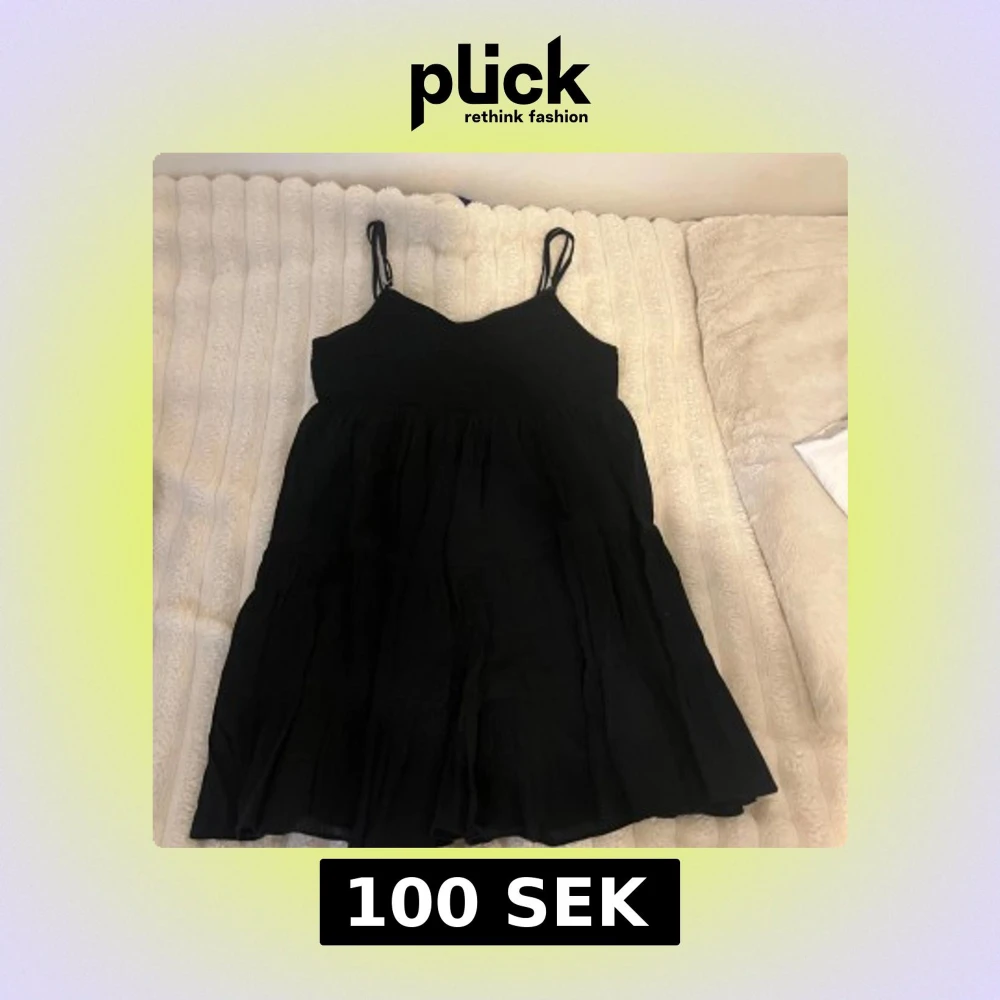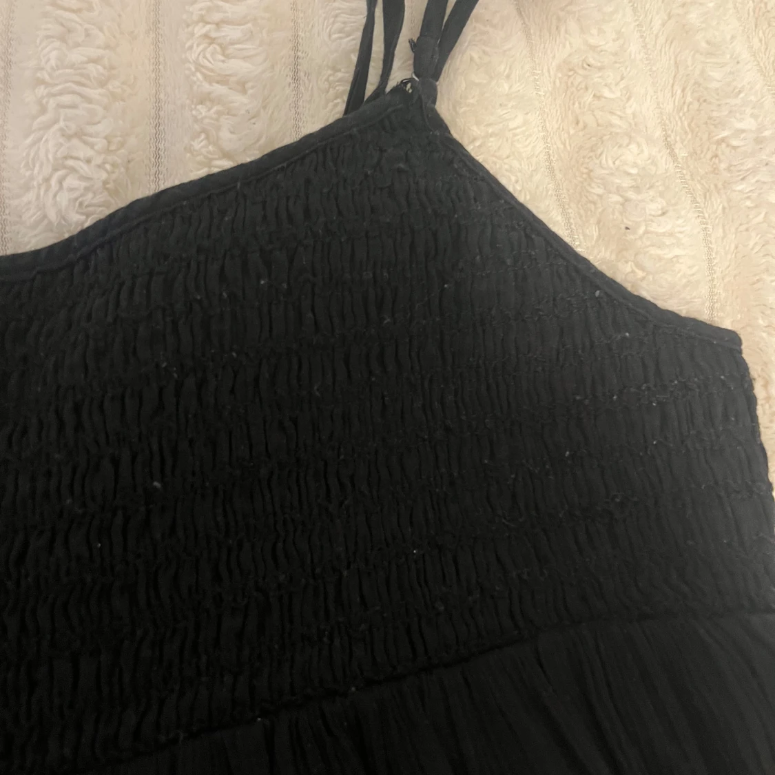 Säljer en svart klänning med smock upptill och tunna axelband. Klänningen har en luftig passform och är perfekt för varma dagar. Den är kort i modellen och har en enkel, stilren design.