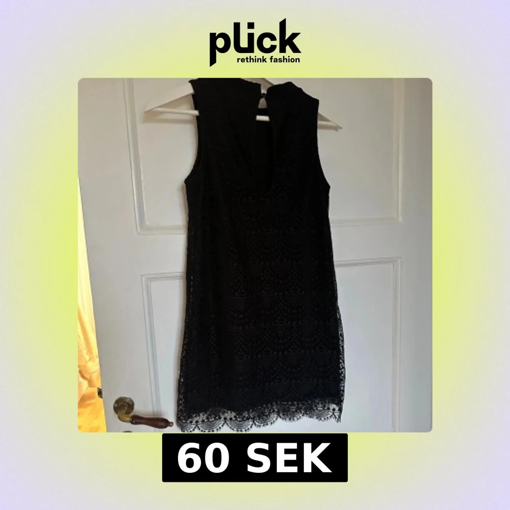 Supersnygg svart ärmlös kortklänning från Gina Tricot i spets med vacker virkad look och rund hals. Klänningen har en liten öppning i nacken och fina spetsdetaljer längs nederkanten. Perfekt för dig som gillar stilrena och trendiga plagg.