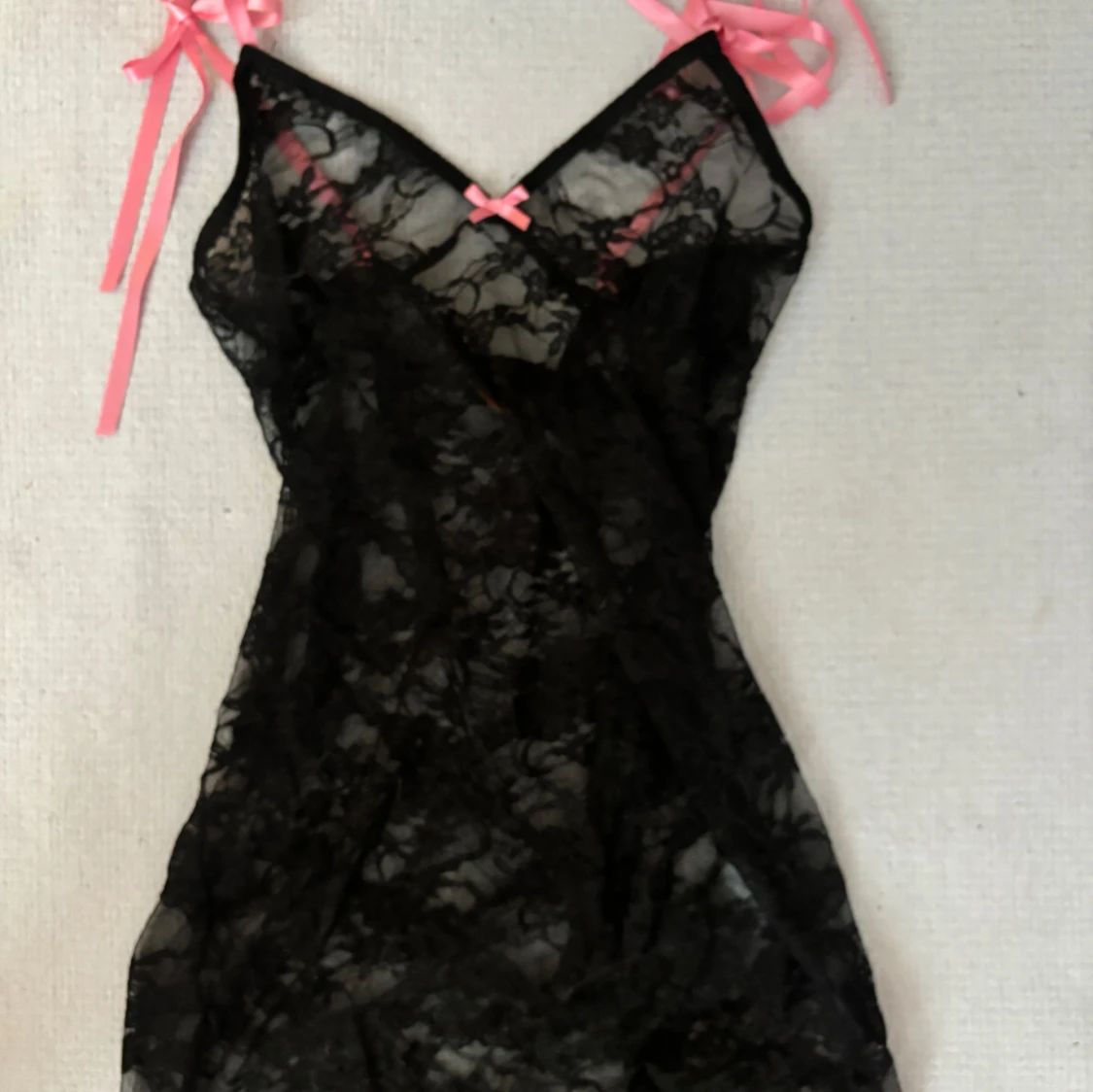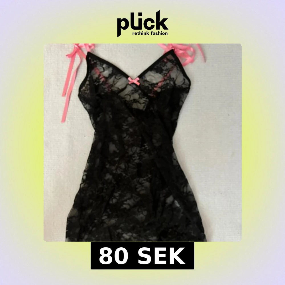 Snygg kort svart spetsklänning med transparent material och rosa rosetter vid axelbanden och bysten. Axelbandslös design med knytband i rosa för en söt kontrast. Perfekt för dig som gillar en lekfull och feminin stil.