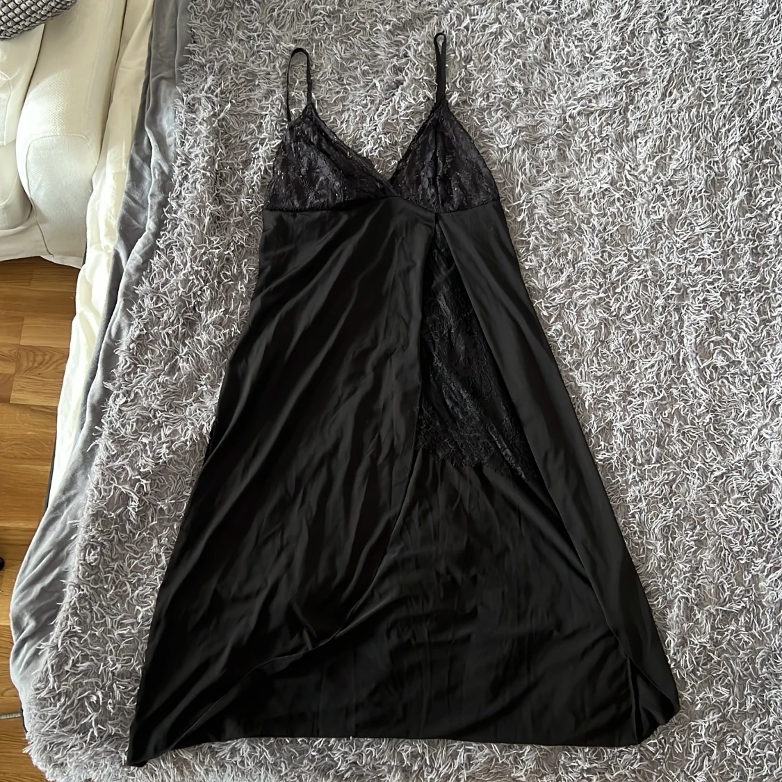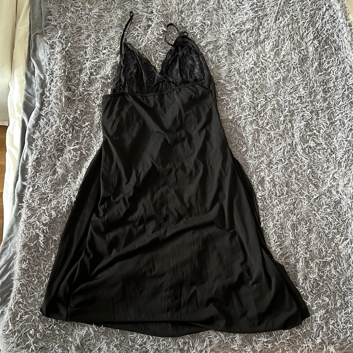 HELT OANVÄND!! Säljer en svart klänning i 100% polyester med tunna axelband och v-ringad spets upptill. Klänningen har en snygg slits framtill och transparent spetsdetalj över bysten och magen. Perfekt för dig som gillar en feminin och lite vågad stil. Första och sista bilderna är på modellen. Nypris 179kr