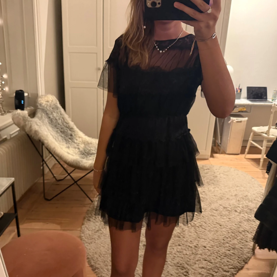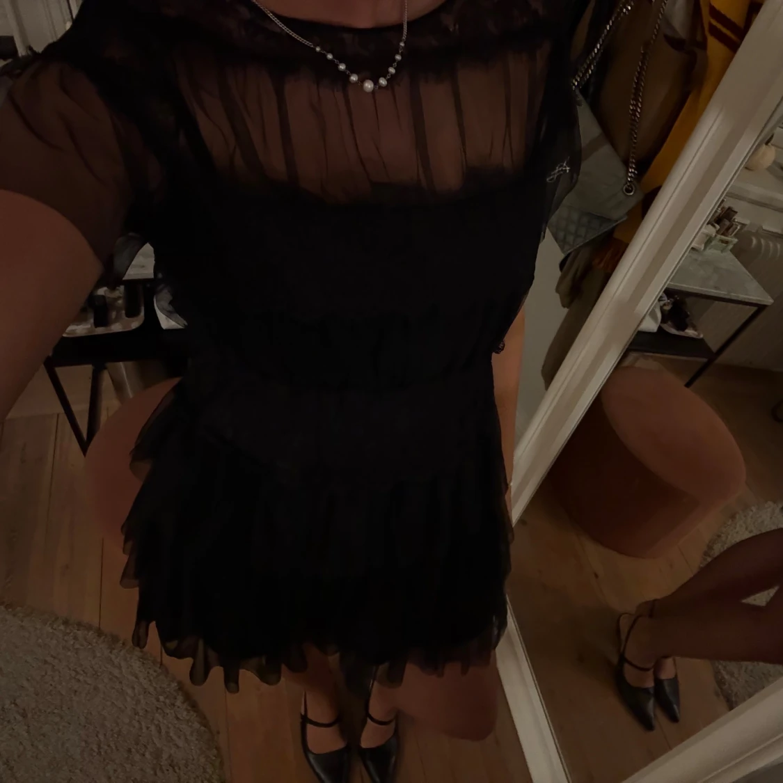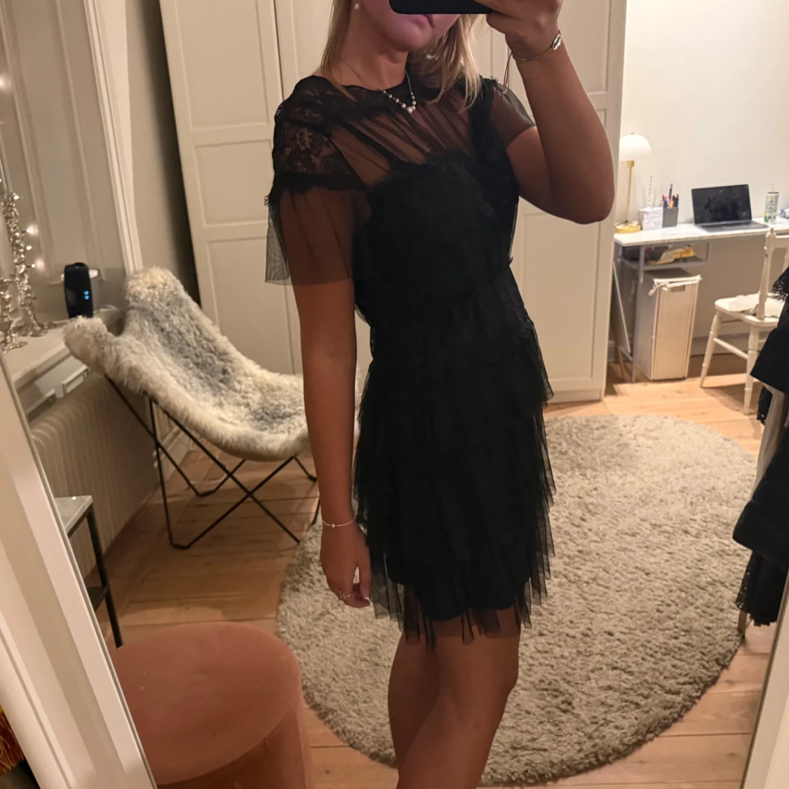 Supersnygg svart kort klänning med spetsdetaljer och volang!🖤🖤Ser exakt ut som By Malinas klänningar💓Så otroligt snygg nu till hösten och vintern. Endast använd 1 gång av mig, så i väldigt fint skick. Går inte att köpa längre. Storlek L men passar mig som vanligtvis har S, så passar alla storlekar därimellan. Skriv för fler bilder!💞