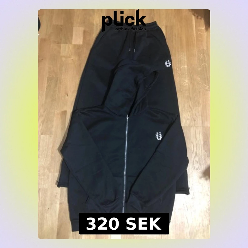 Svart tracksuit i relaxed fit, storlek L. Set med hoodie och matchande byxor. Helt ny, bara provad – inga defekter. Mjuk, bekväm och perfekt både till vardags och chill. Hoodie med dragkedja och framfickor. Byxor med resår + dragsko i midjan för skön passform. Diskret broderad logga i vitt på både hoodie och byxa. • Färg: Svart • Storlek: L • Skick: Helt ny • Passform: Relaxed fit Snygg, stilren och enkel att matcha ⭐ Säljer pga fel storlek.