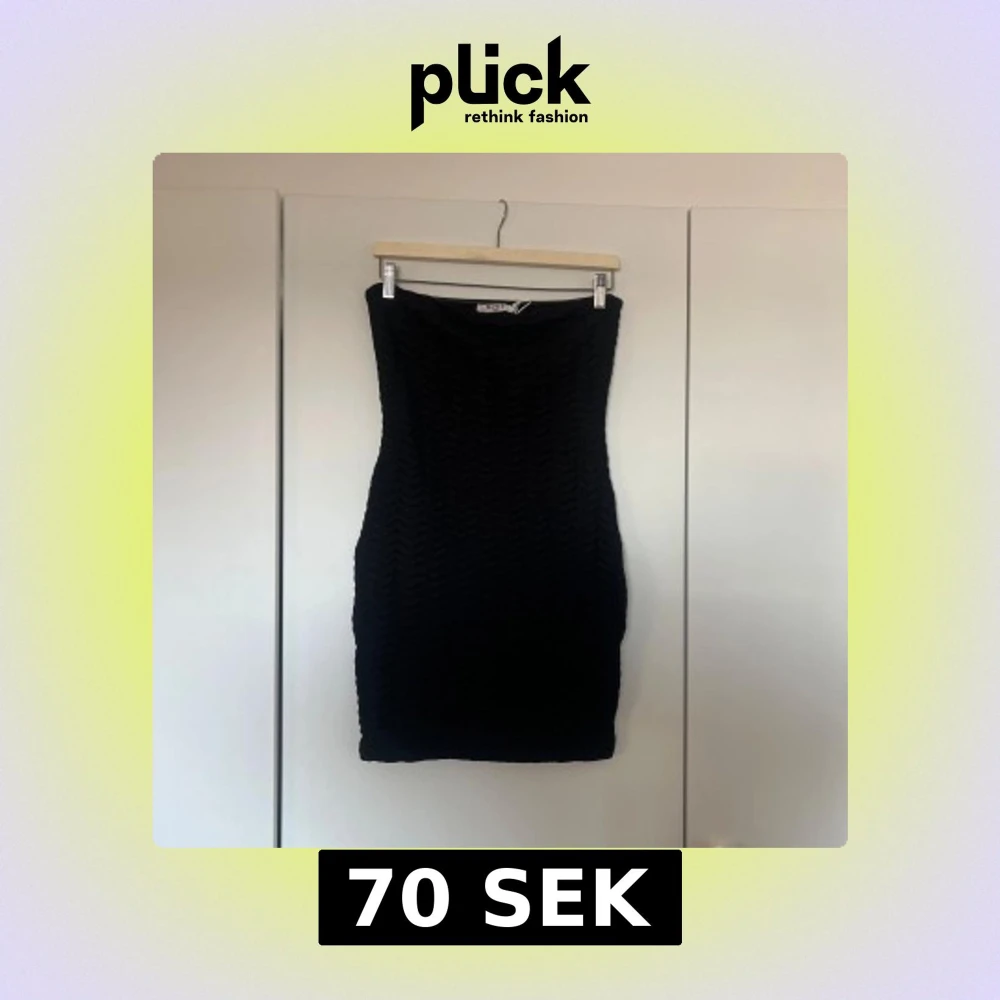 Säljer en svart tight klänning utan axelband . Klänningen är kort och har en enkel, stilren design med diskret struktur i tyget. Perfekt till sommaren! Den är i super bra skick då den aldrig är använd och prislappen sitter fortfarande kvar!🫧✨