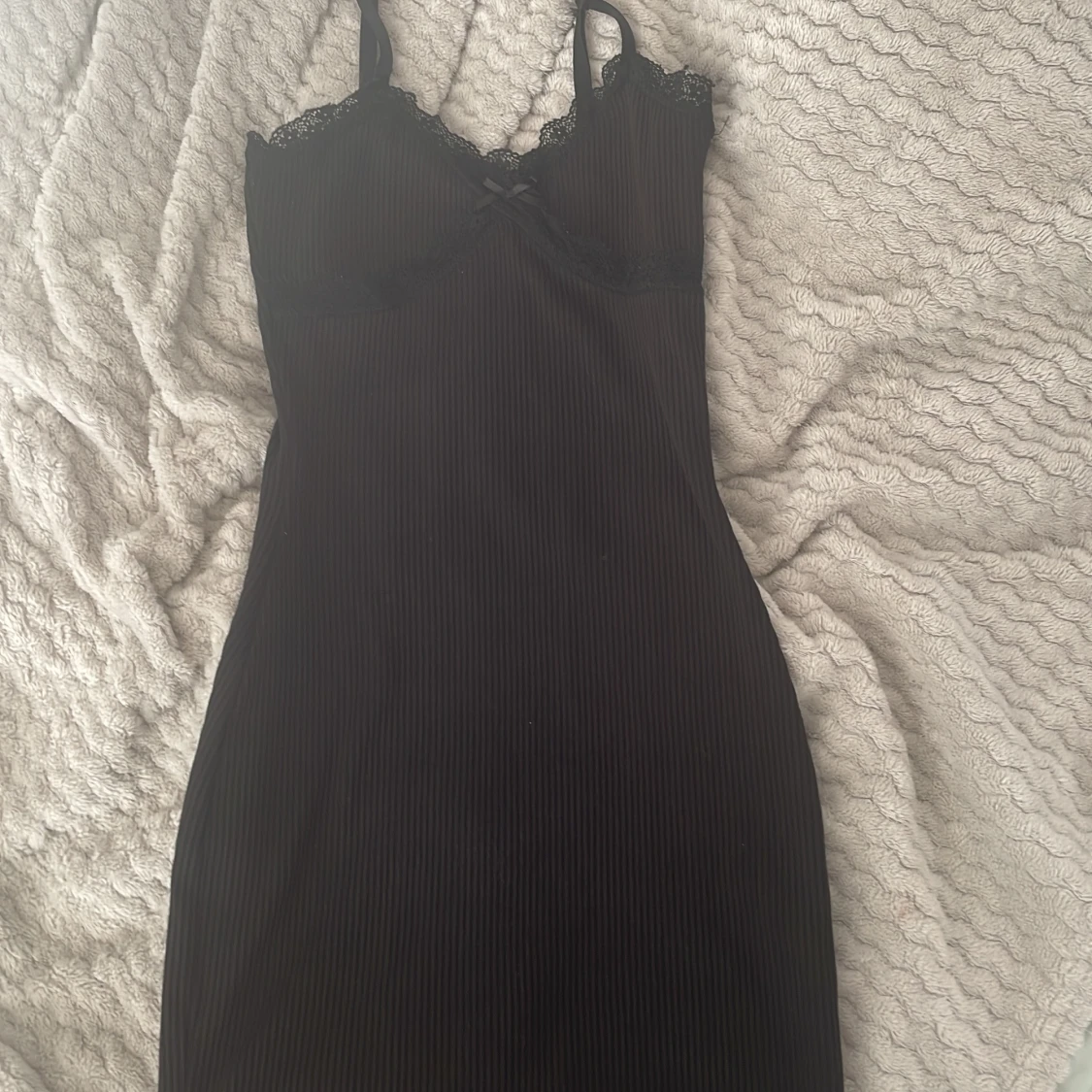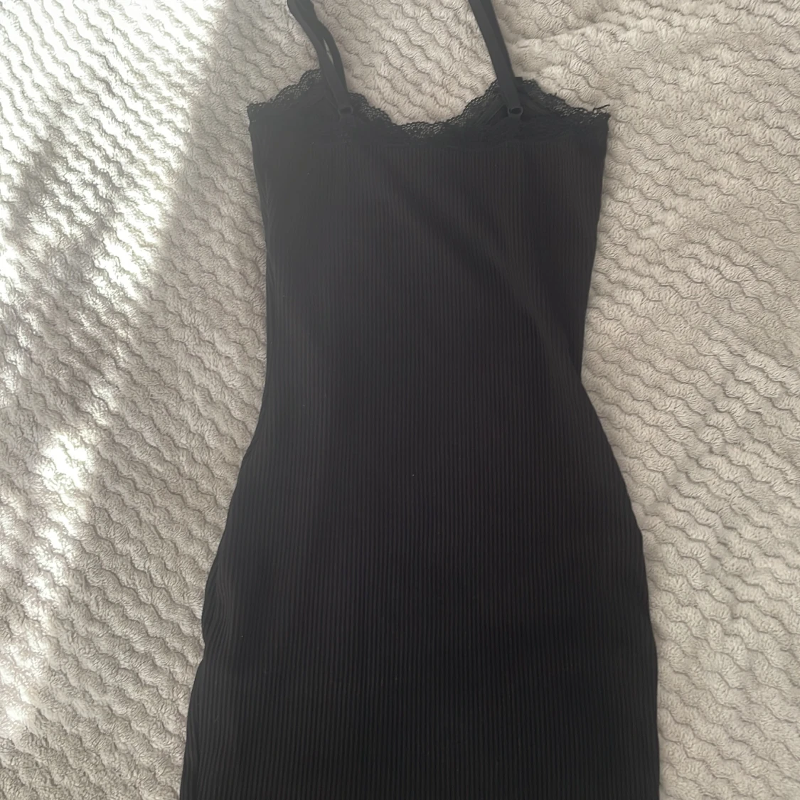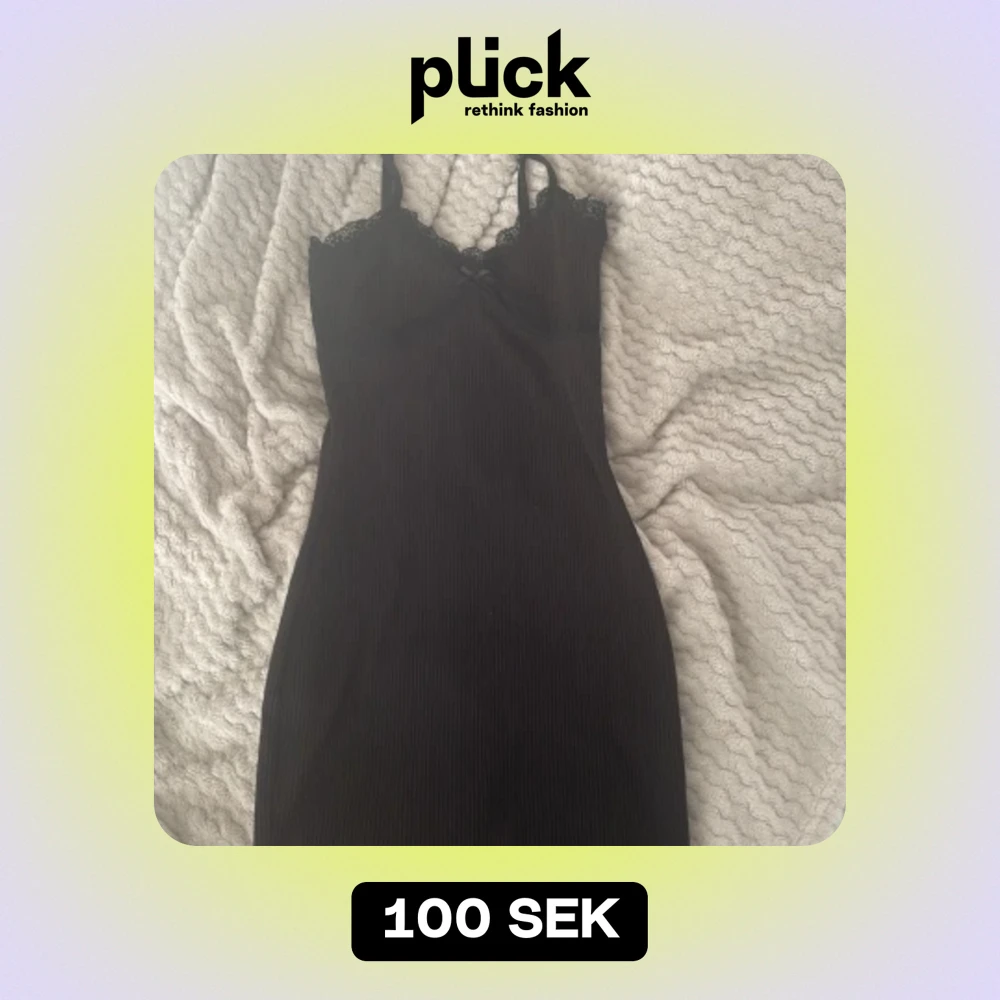 Tight svart klänning med en liten rosett och spets. Använd ett par fåtal gånger och säljer då den inte används längre.