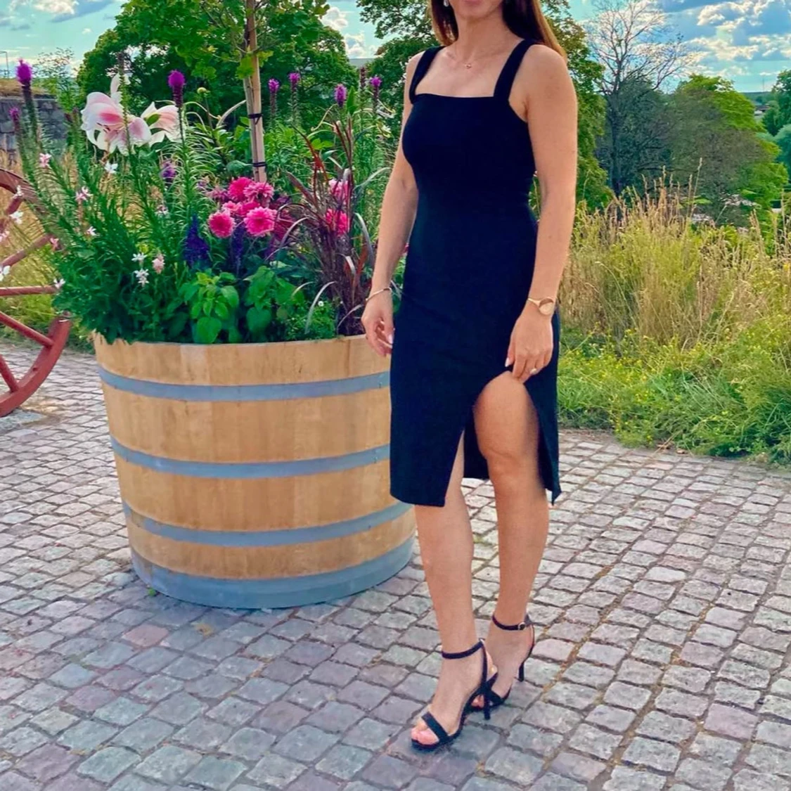 Säljer en svart, tight klänning med breda axelband och en hög slits på ena sidan. Klänningen har en enkel och stilren design som framhäver figuren. Perfekt för dig som vill ha en klassisk look med en twist.