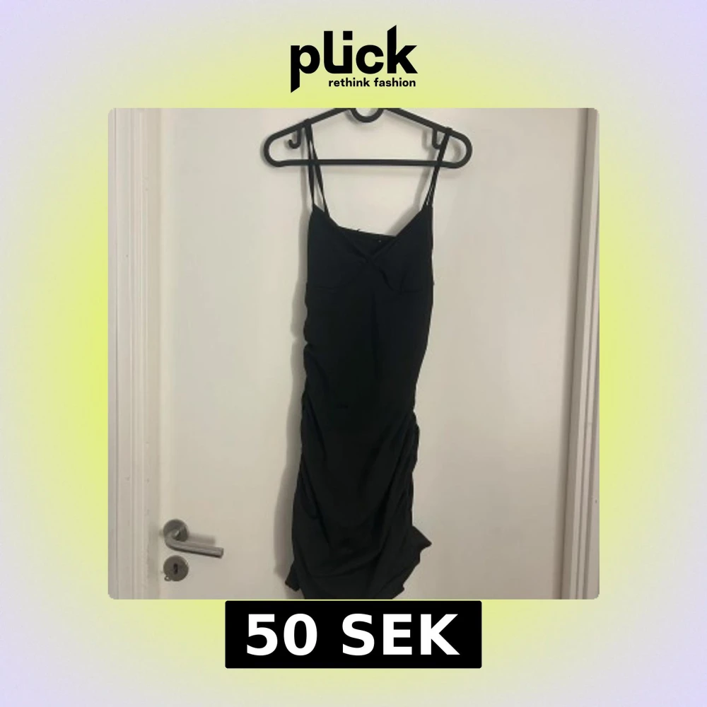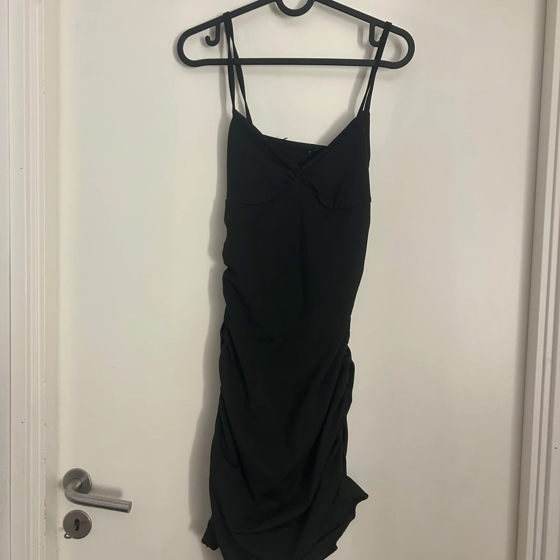 Säljer en svart tight kortklänning med smala axelband och draperad detalj på sidan. Klänningen har en enkel och stilren design som passar perfekt till sommarens alla tillfällen.