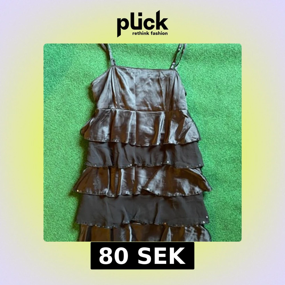 Supersnygg svart klänning från KappAhl med flera lager volanger och smala axelband. Klänningen har en glansig satinliknande yta och små paljettdetaljer längs volangkanterna. Perfekt för dig som vill sticka ut med en cool och trendig look.