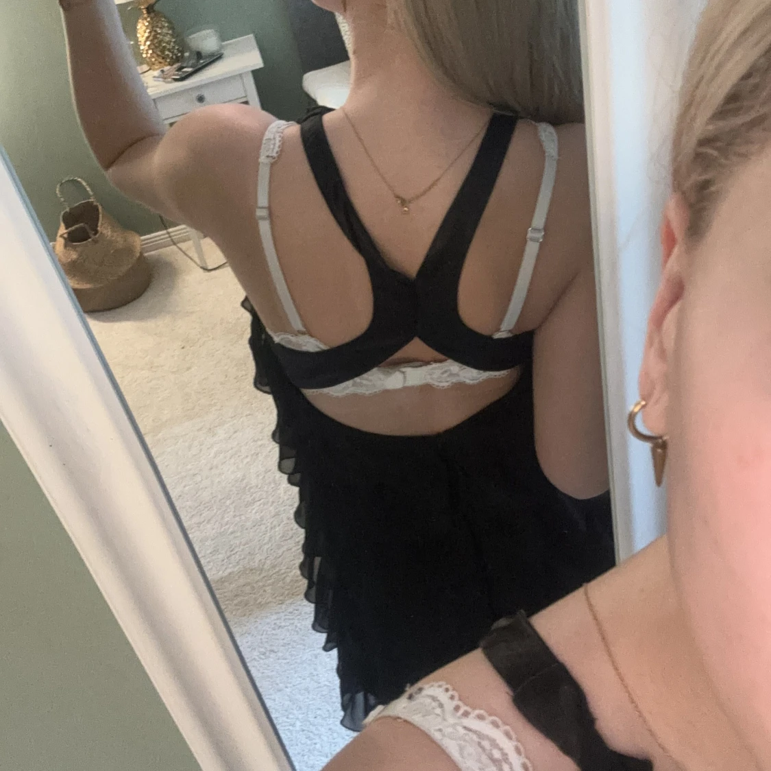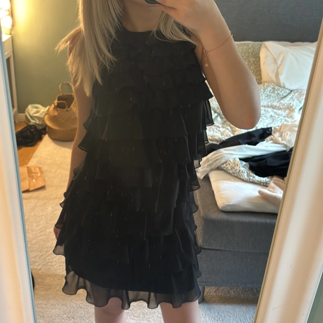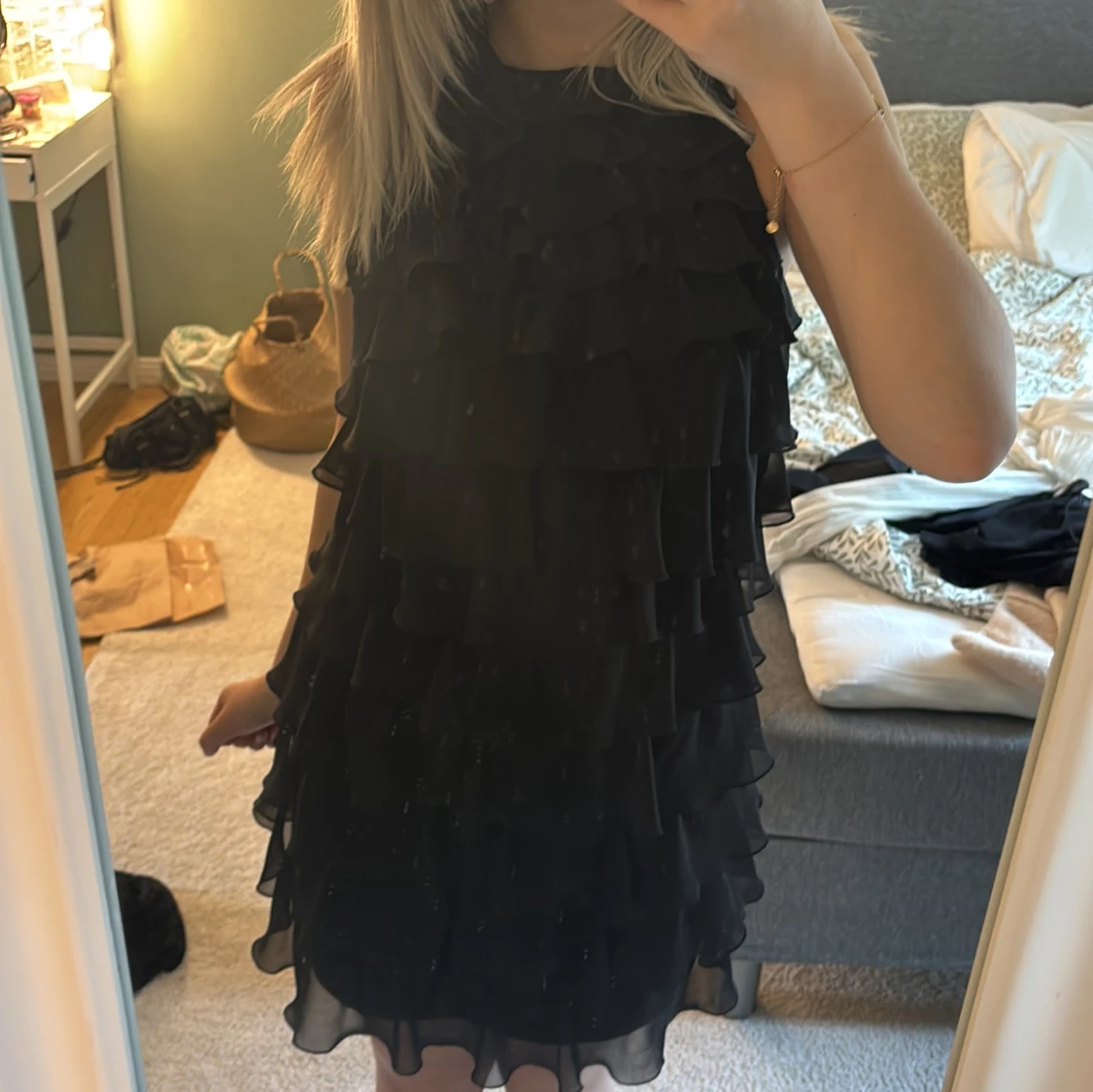 Supersnygg svart kortklänning med flera lager volanger och öppen rygg. Klänningen är ärmlös och har en luftig känsla, perfekt för dig som vill sticka ut. Materialet känns lätt och flowy, och ryggen har en cool cut-out detalj.