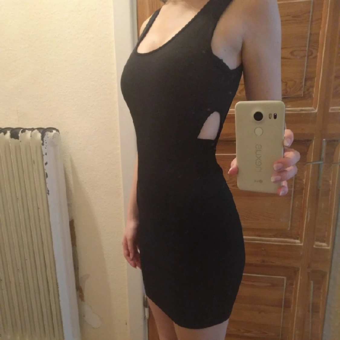 Tight klänning i "scuba"-material Lite insydd i midjan Hål på vardera sida om midjan(bild2)