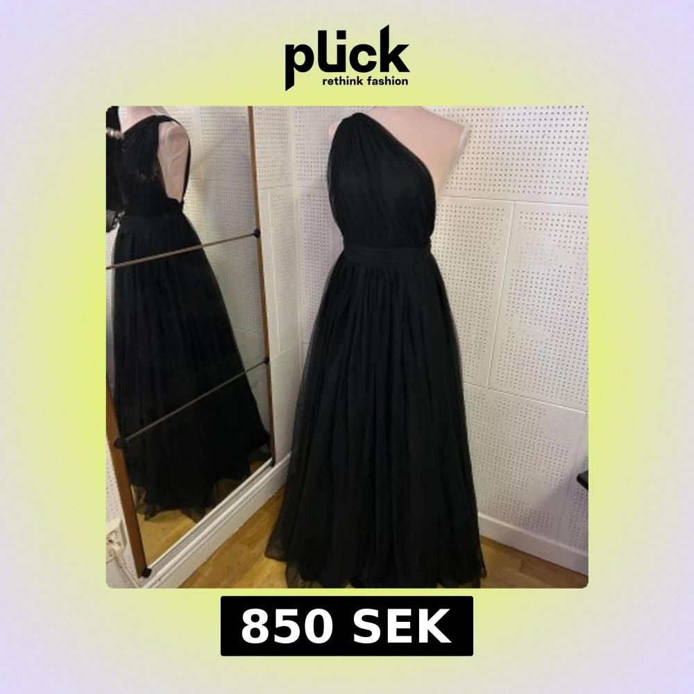 Elegant svart långklänning med oneshoulder-design. Klänningen har ett flödande tyg som ger en vacker siluett och är perfekt för speciella tillfällen. I fint skick. Storlek XS.