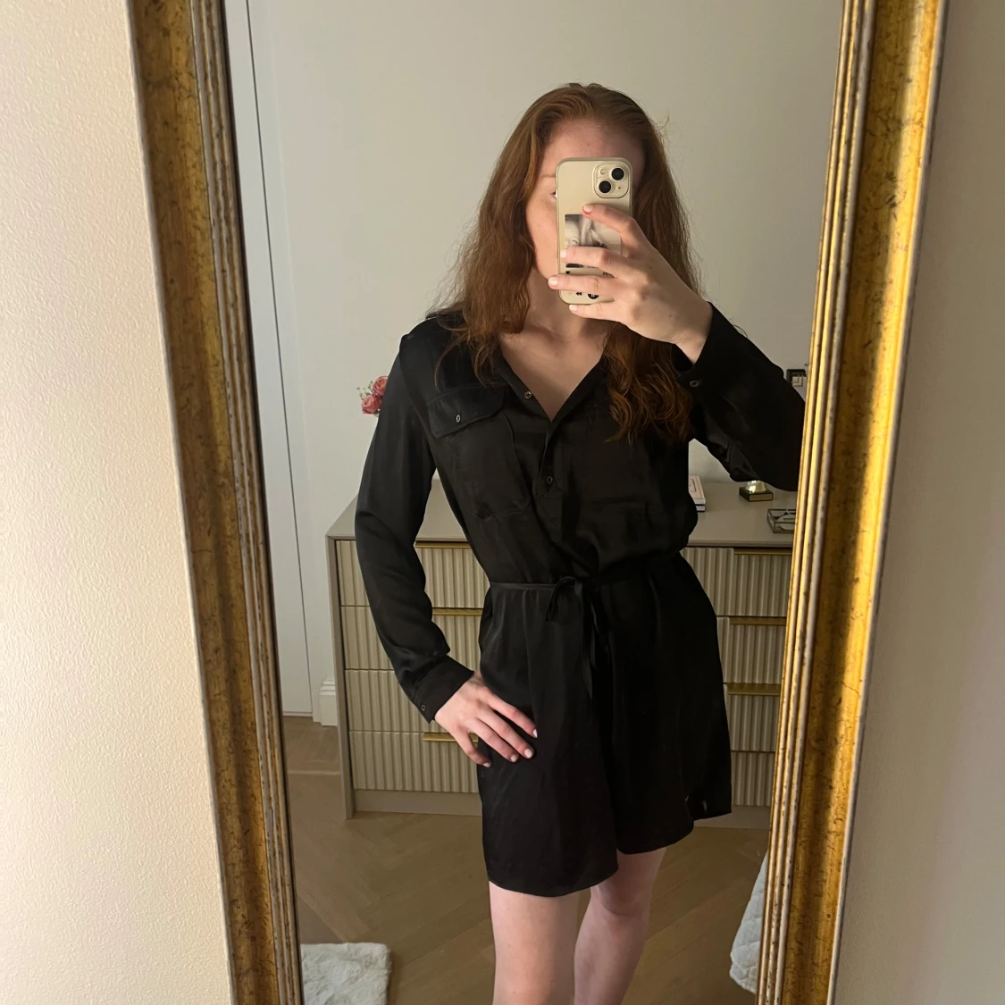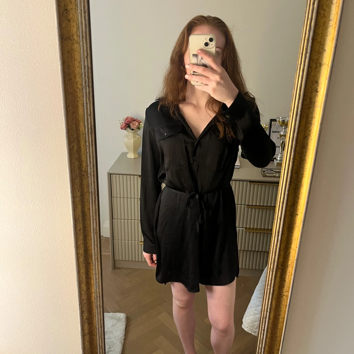Säljer en svart skjortklänning med lång ärm och knytband i midjan. Klänningen har krage, knappar framtill och två bröstfickor. Perfekt till alla årstider.