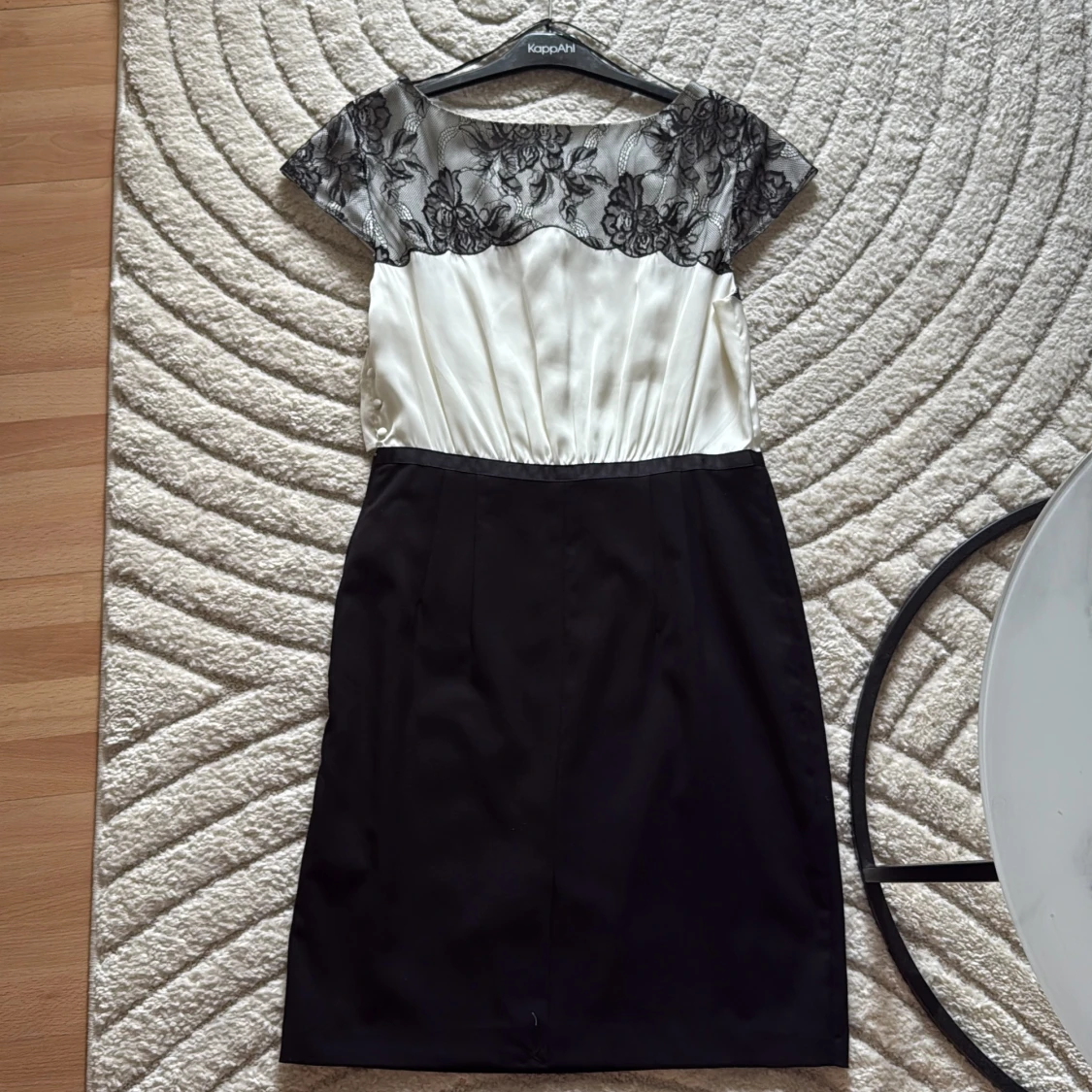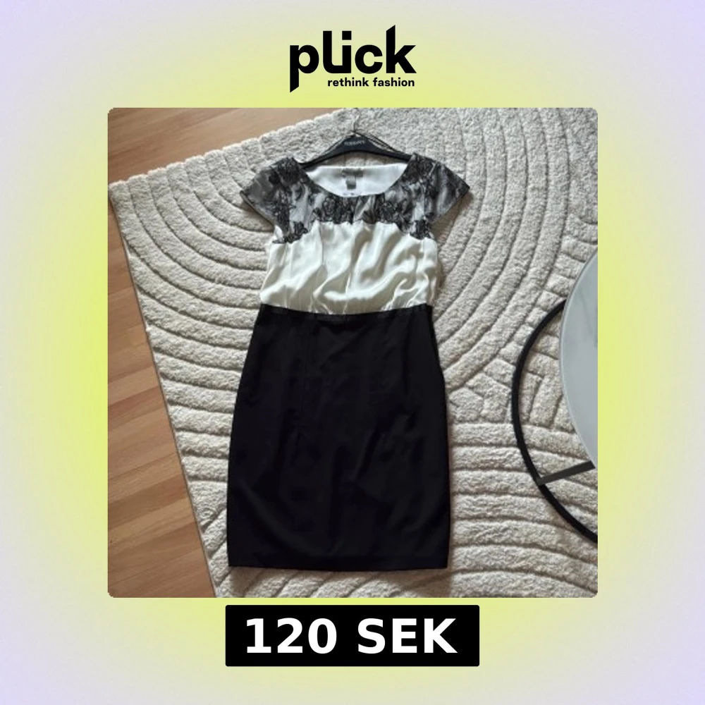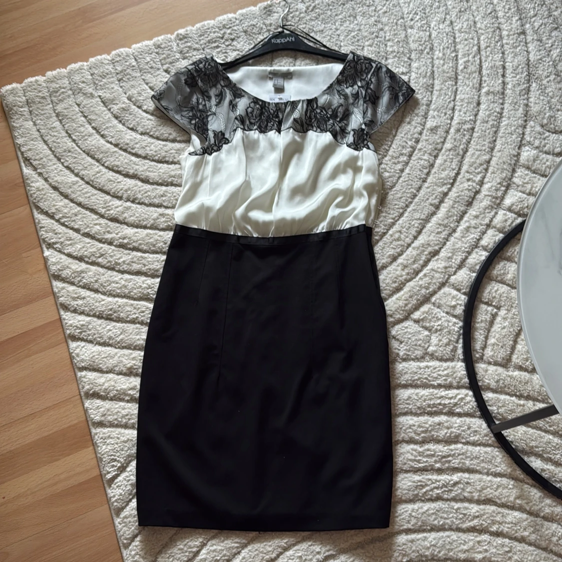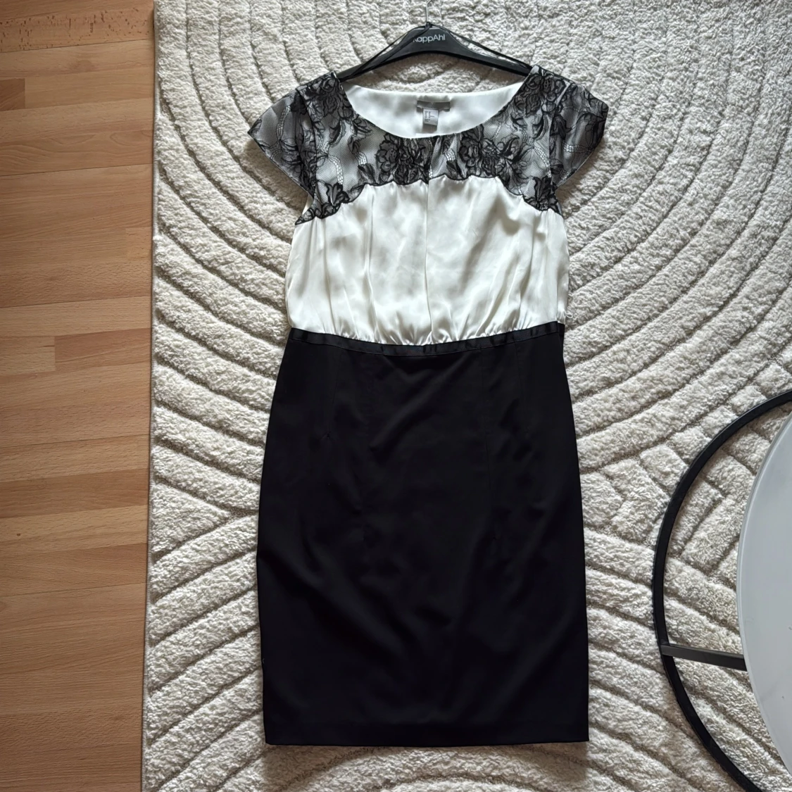 Snygg svartvit kortklänning från H&M med överdel i glansigt vitt tyg och svart blommig spets upptill. Kjoldelen är svart och rak. Perfekt för dig som gillar klassisk stil med en twist. Axelpartiet har transparent spets och klänningen har korta ärmar.